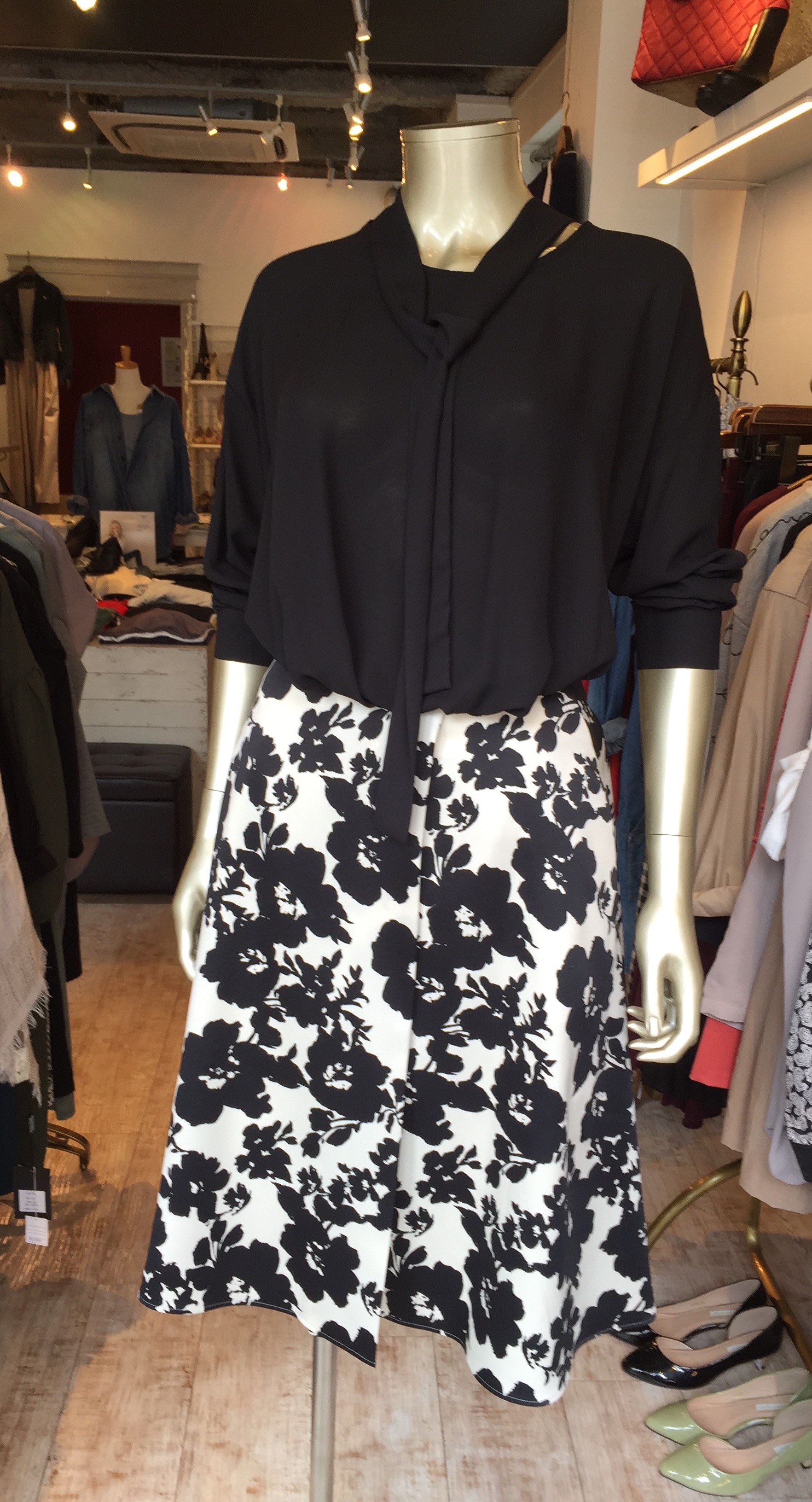 ボウタイブラウスとプリントスカート 老舗国内メーカーの素敵なスカートが入ってきました(⌒▽⌒) 大きめの花柄と巻き風のデザインが今年らしい お色違いで茶系もございますー ボウタイブラウス 9612円 花柄スカート 14040円 2016年9月8日