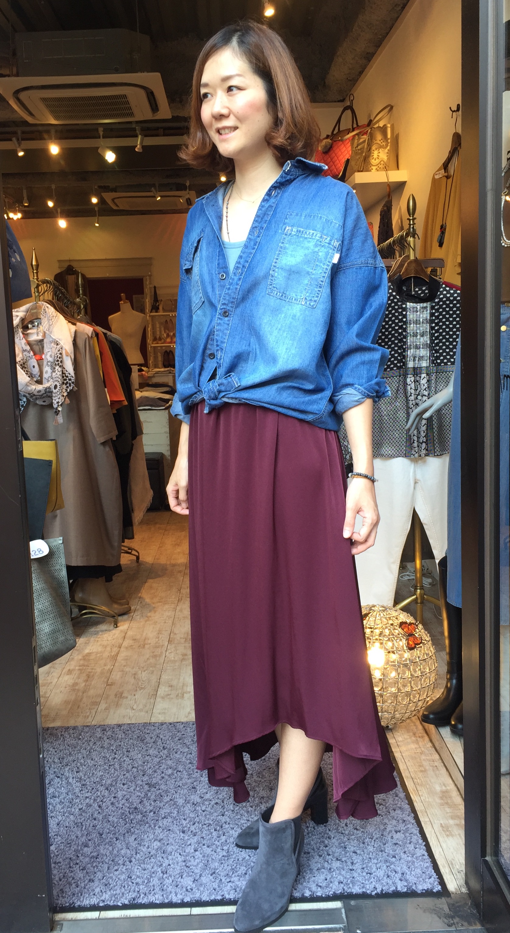 アシンメトリーロングスカート &ビックシルエットデニムシャツ ふわっとやわらかい感じのデニムシャツとこっくりとしたボルドーのロングスカート、足元はショートブーツで合わせてみました。 秋を感じるスタイリングです♡ 夏物に飽きたら、今すぐ着られる秋物を投入‼️ 気分もリフレッシュしますよぉ〜 デニムシャツ 7668円 アシンメトリースカート 11880円 2016年9月8日
