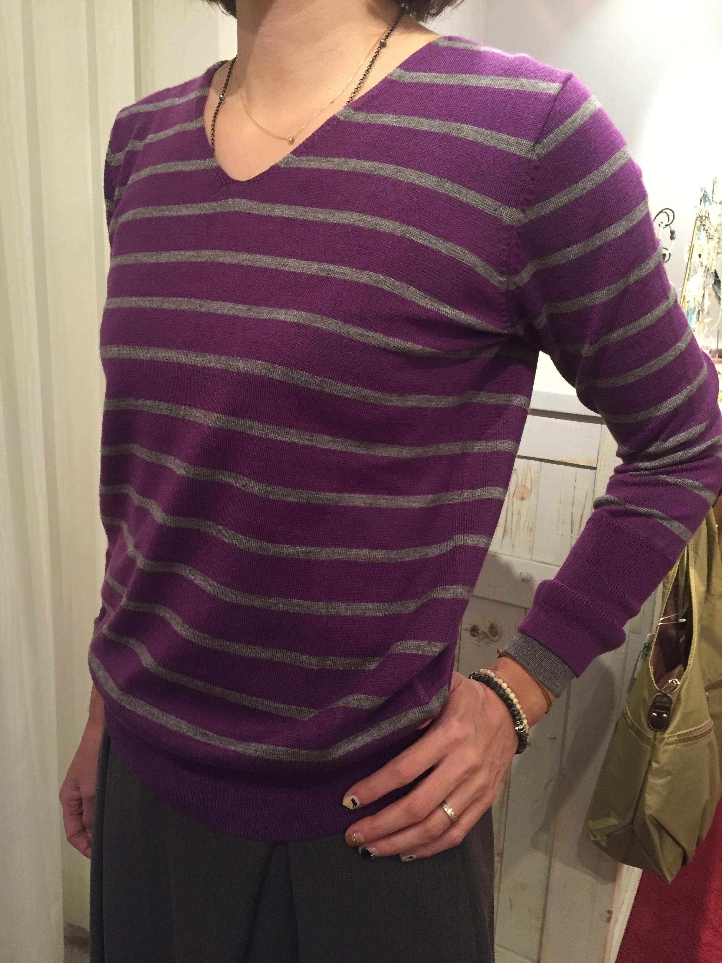 ボーダーニット 7452円 シックな秋カラーのボーダーニットが入荷しました。 サラサラの素材なので、素肌に着ても肌触り抜群です(⌒▽⌒) お写真のパープルの他に、ベージュにグリーン、グレーにブラックのボーダーなどがございます。 直ぐに着られますよぉ〜 Vネックボーダーニット 7452円 2016年10月7日