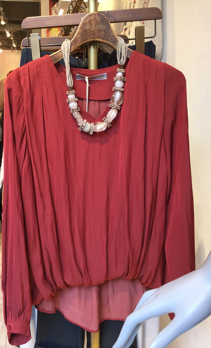 シフォンブラウス 9612円 シックな赤のシフォンブラウスはいかがでしょう?フロントにタックがあるので、そのままサラッと着て頂けば、完成しますよぉ〜 素敵な赤には、なかなか巡り会えませんよぉ〜 2016年10月9日