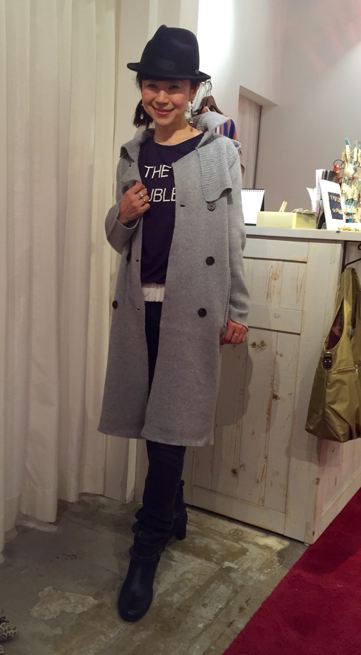 ニットコート グレー トレンチコート風のデザインがおしゃれなニットコートです💓 軽くてスタイリッシュ💓ですよぉ お写真のカラーと、お色違いでチャコールグレーの2カラーです ニットコート 21384円 中折れハット 6372円 2016年10月17日