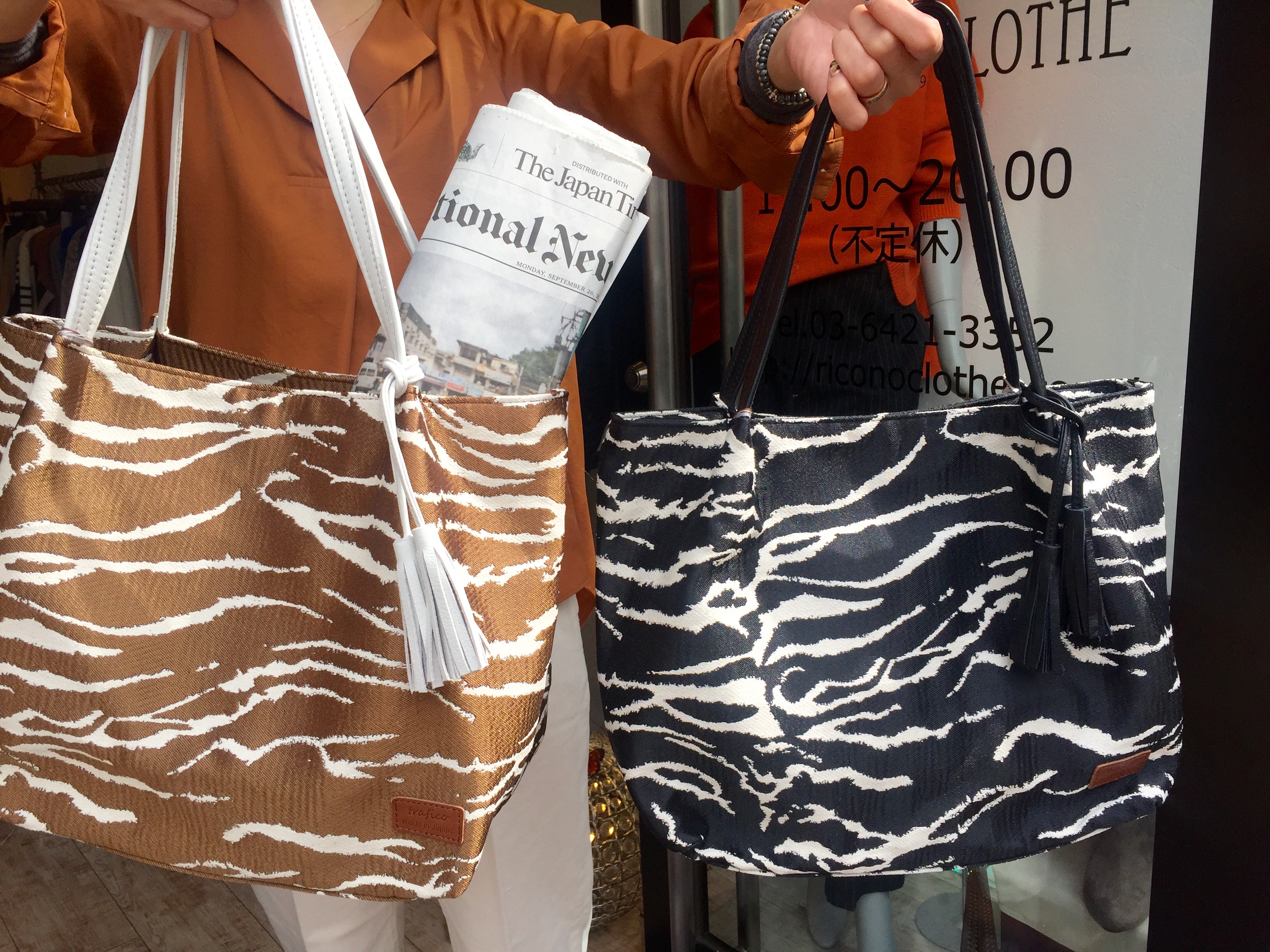 made in japan ゼブラトートバッグ おしゃれな織りのゼブラ柄が高級感の、ファッショナブルトートバッグが、何と8900円💓 お色は、ベージュとブラックの2カラーです 軽くてサクサク入りますよぉ〜 冬の着こなしに、スタイリッシュなポイントとなります 2016年10月18日