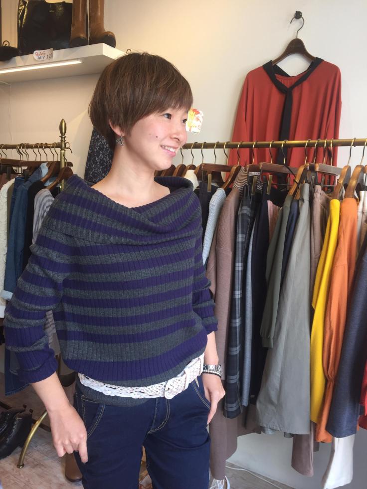 ボーダーニット 11880円 新作のボーダーニットは、ネイビー✖️カーキのおしゃれな配色です♡ 濃い目のデニムで合わせるときは、白いベルトで爽やかさをオン♡ オフショルダーにもなりますよぉ〜 2016年10月23日