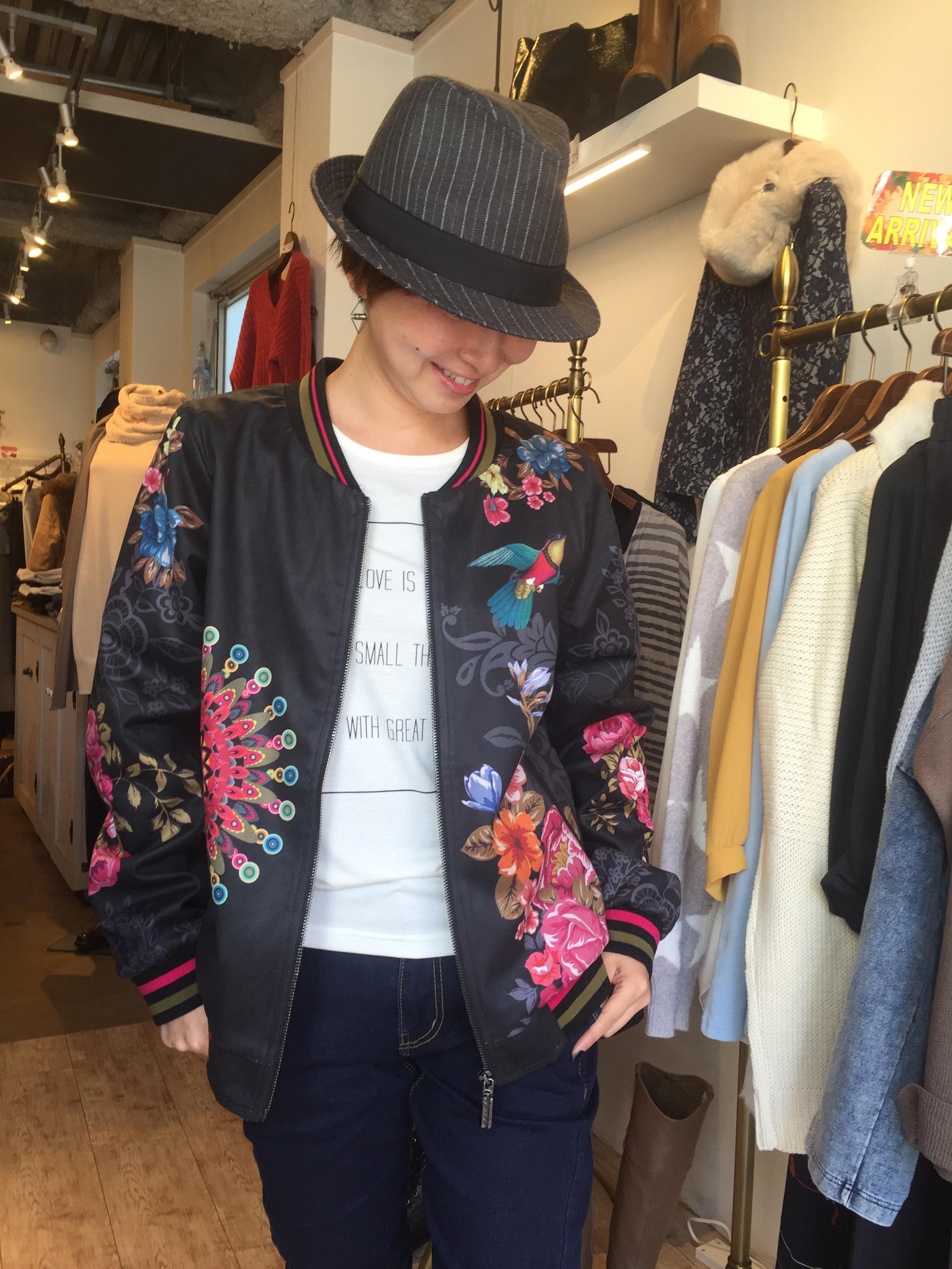 フランスインポートのブルゾン MA1デザインのブルゾンをこんなクールな花柄で作るなんてーーー、さすが、おパリのセンスーーーっ ブルゾンが主役だから、他はさりげなく、、、 風を通さないから、かなり保温力もありますよぉ〜 2016年10月26日