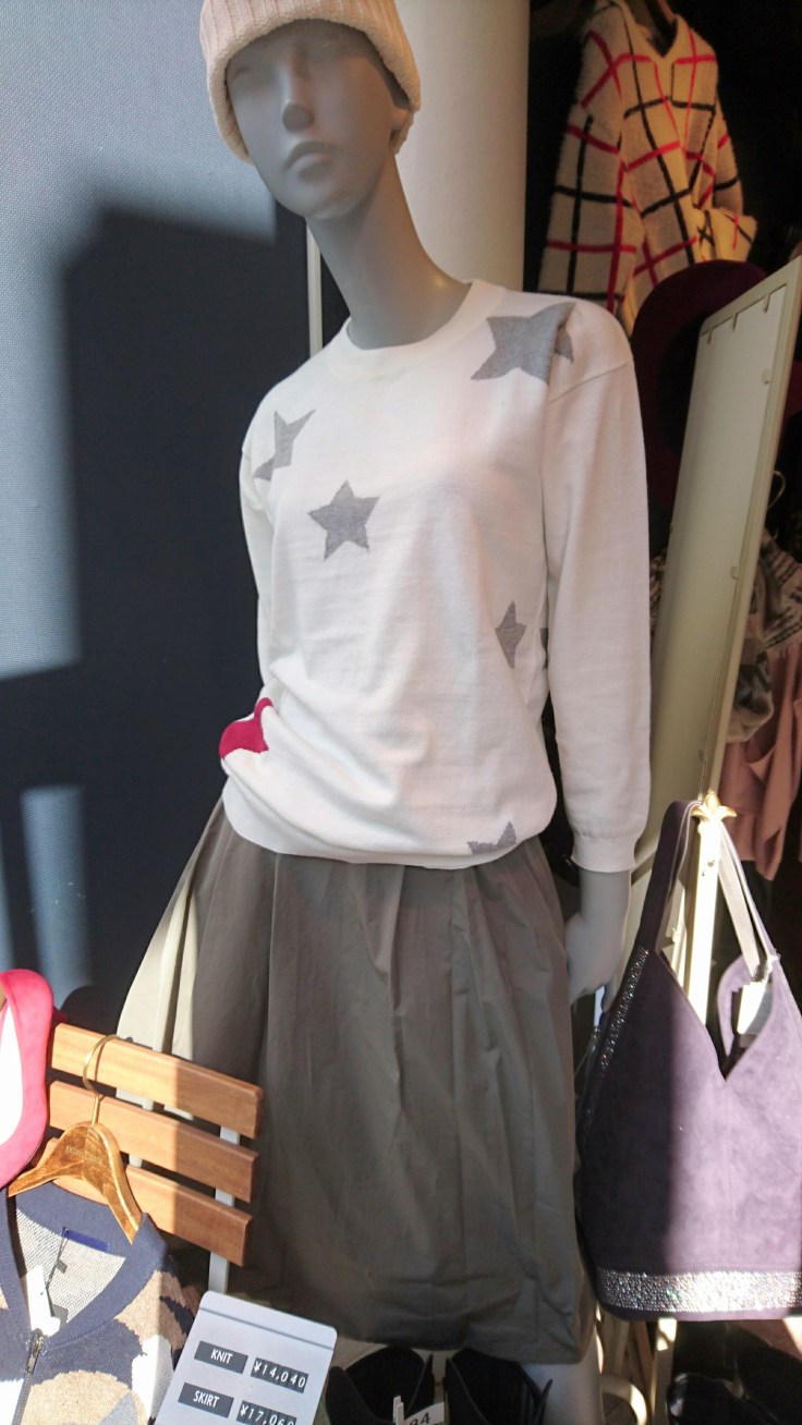 星ニットとフレアースカート♪ 着丈長めの星ニットとシャリ感のある素材のスカート♪ 大人カジュアルスタイルでお出かけを楽しんでくださいませ~ ニット 14040円 スカート 17064円 2016年10月27日