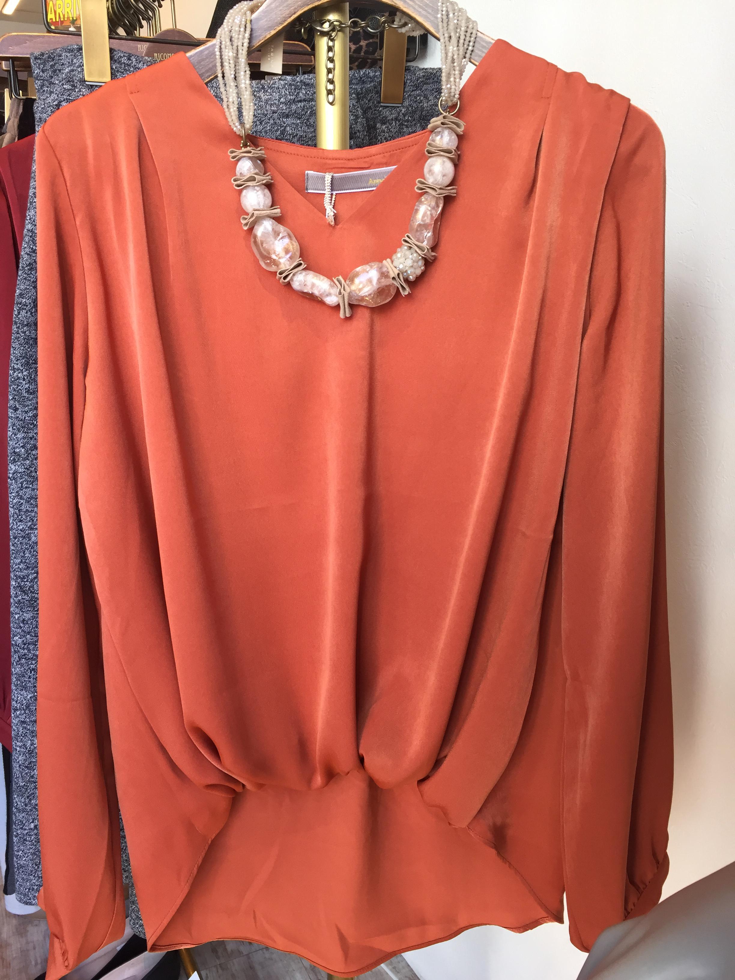 アプリコットオレンジのブラウス 大人気カラーのブラウス 再入荷いたしましたっ トロン、、、とした質感で、高級感もバッチリですよぉ〜 生地と縫製の良さを保証いたします カーキ、ネイビー、オレンジ、レッドの4カラーで展開しております ブラウス 9612円 2016年11月3日