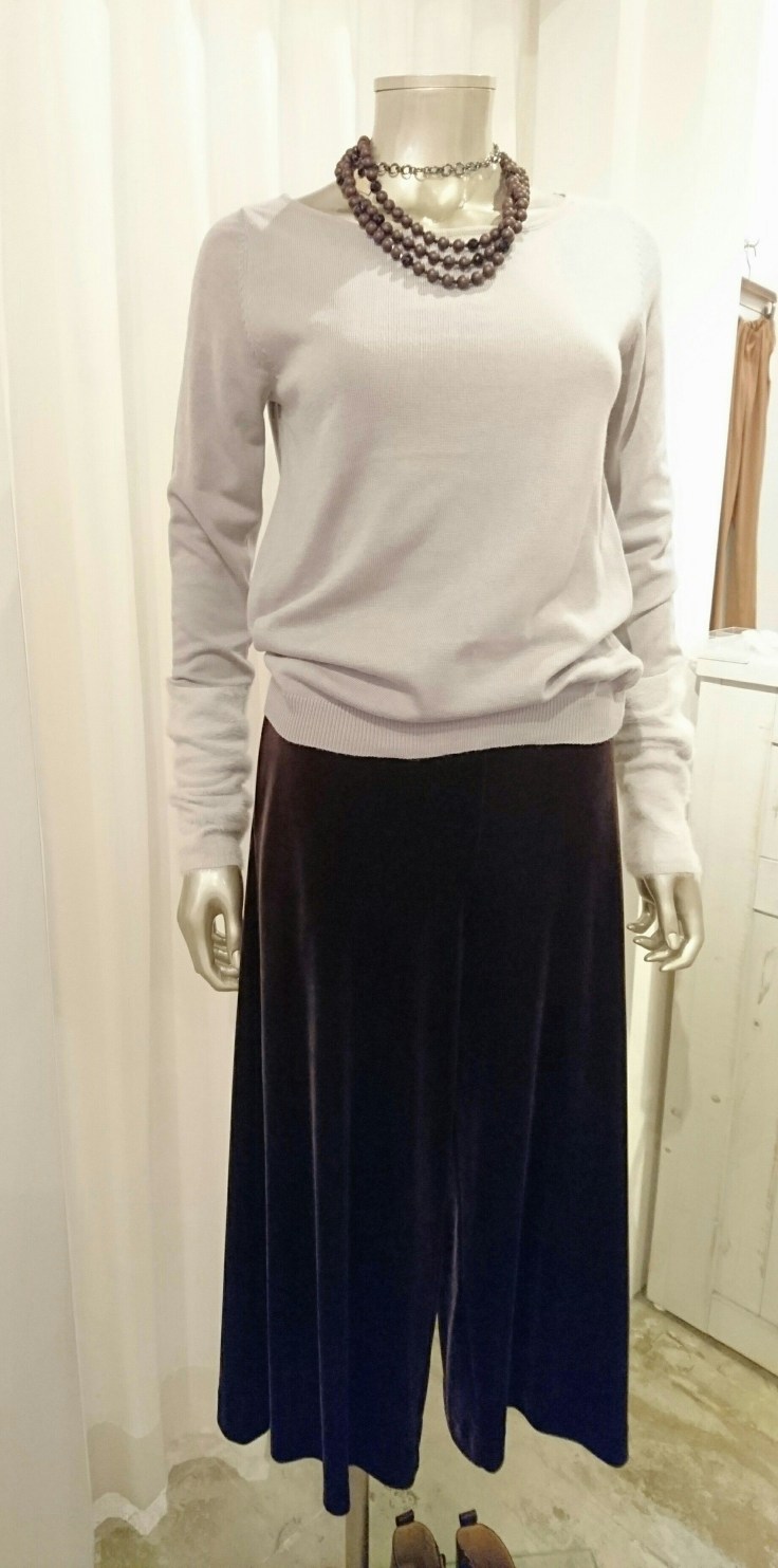アンゴラ混ニットとベロアのガウチョ♪ 袖にフェイクファーが付いている薄手のニット。アンゴラ混なので、薄手でも暖かいですよ~ ベロアのガウチョと合わせて今年っぽく~♪ ニット 9612円 パンツ 10584円 2016年11月8日