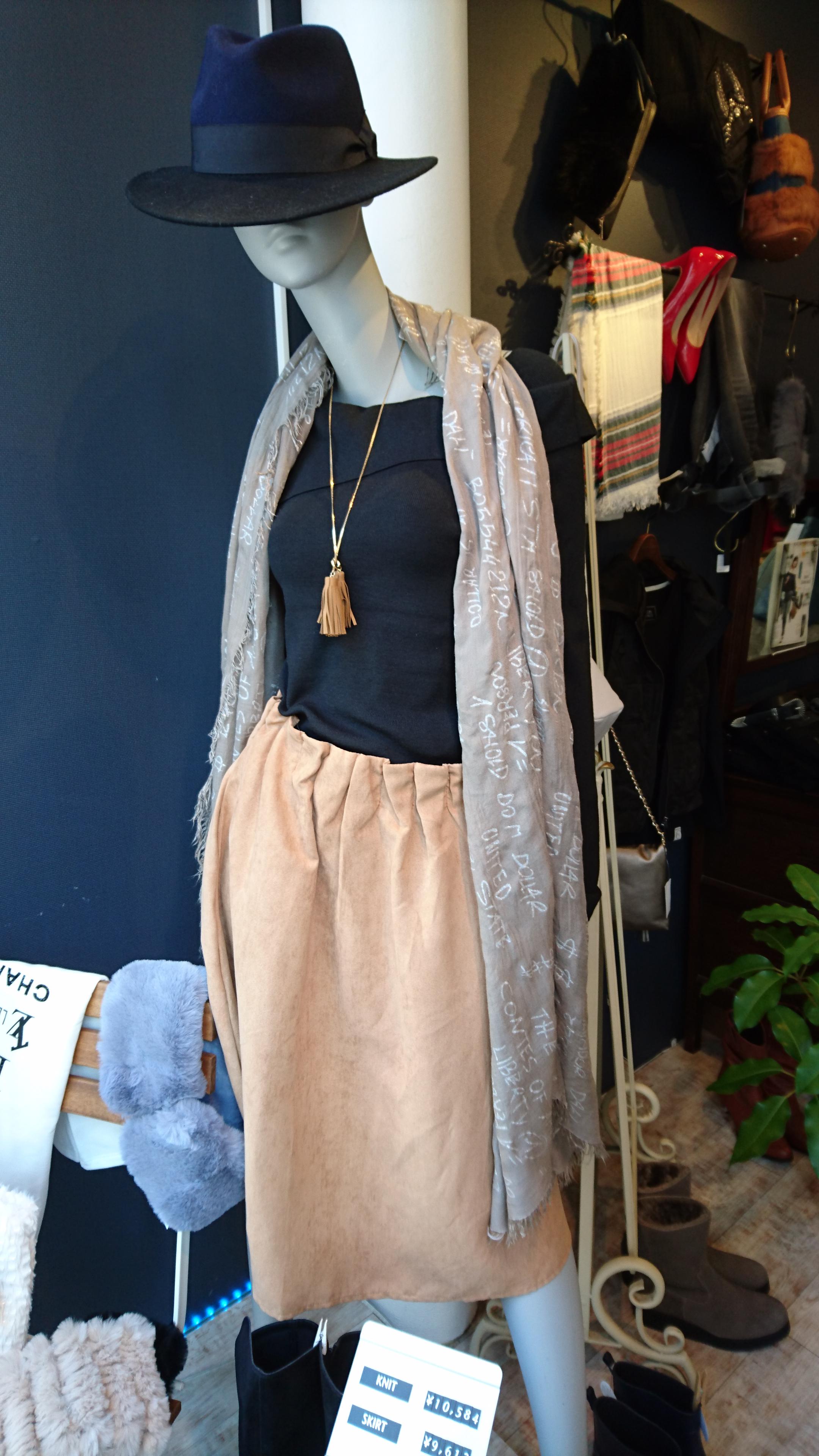 オフショルニットとスウェードスカート♪ すっきり見えるオフショルニットは、ブラ線が隠れるデザインで安心(^-^) ふんわりスウェードスカートと合わせてカッコ良く~♪ ニット 10584円 スカート 9612円 2016年11月13日