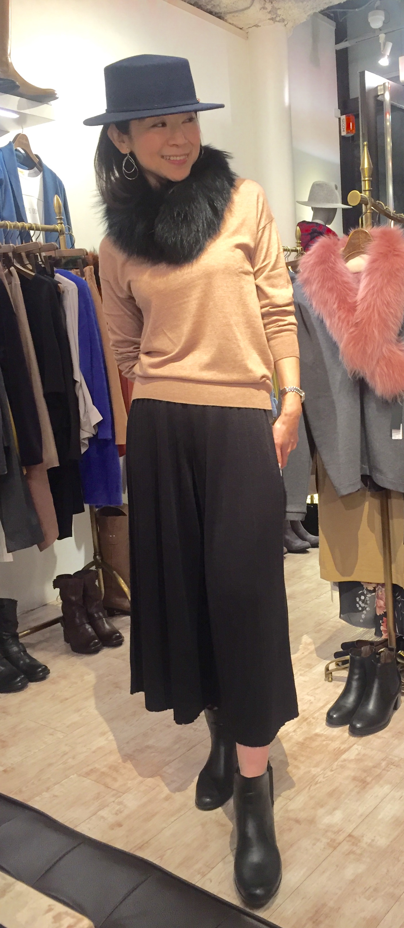 カシミア&ウールの極上のニット 8532円とファ ー 10584円 こちらは、カシミアと極上ウールのしっとりしたニットで、黒のワイドパンツをコーディネートしてみました。 ポイントは襟元のファーマフです こちらは、マグネット式なので、ピッと出来て、とっても楽チン‼️メーカーが自信を持ってご提案させて頂くファーマフは破格です‼️ シンプルな着こなしがゴージャスに変身ですよぉ〜 今期は履きやすさ抜群のニットワイドパンツをぜひワードローブに入れてくださいねー 旬の着こなしが楽しめますよぉ〜 ニットワイドパンツ 11664円 メタルハット 7452円 2016年11月16日