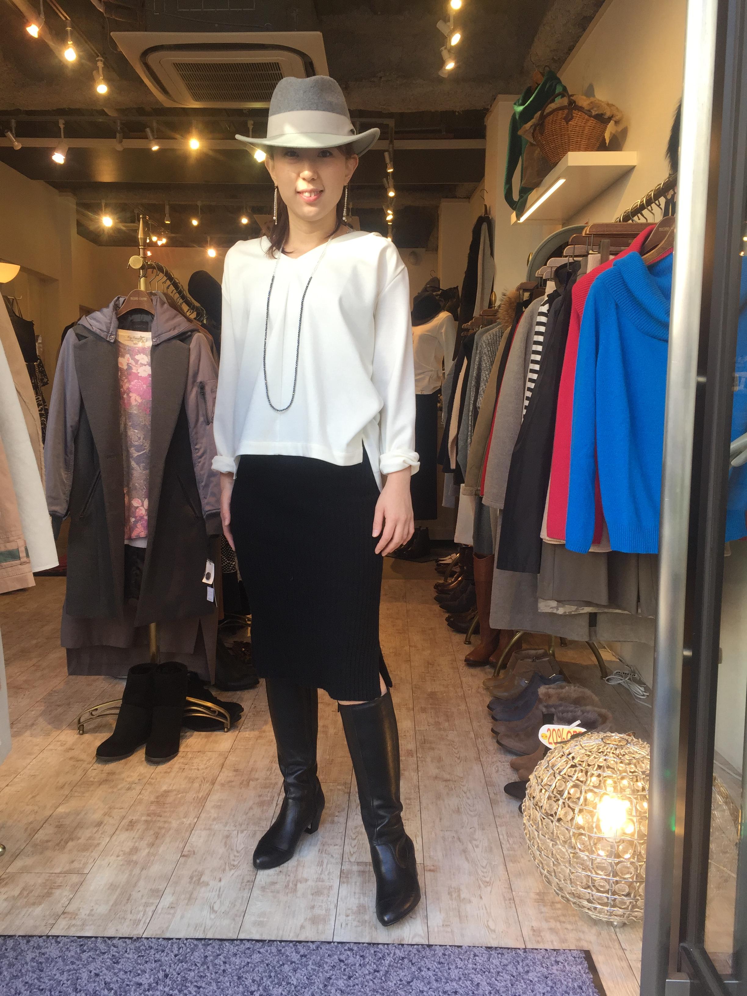 デザインブラウス & タイトスカート 洗ってもすぐに乾く、シワにならなくて、んでもって、おしゃれなブラウスが大人気です! アイボリー、ブラック、グレーの3カラーで展開中💓 ブーツもスカートも新年に向けて新しいのを揃えておきたいですもんね 是非とも お気に入りの一枚をゲットーーーしてくださいね ブラウス 11664円 スカート 11664円 バイカラーハット 7452円 2016年12月13日