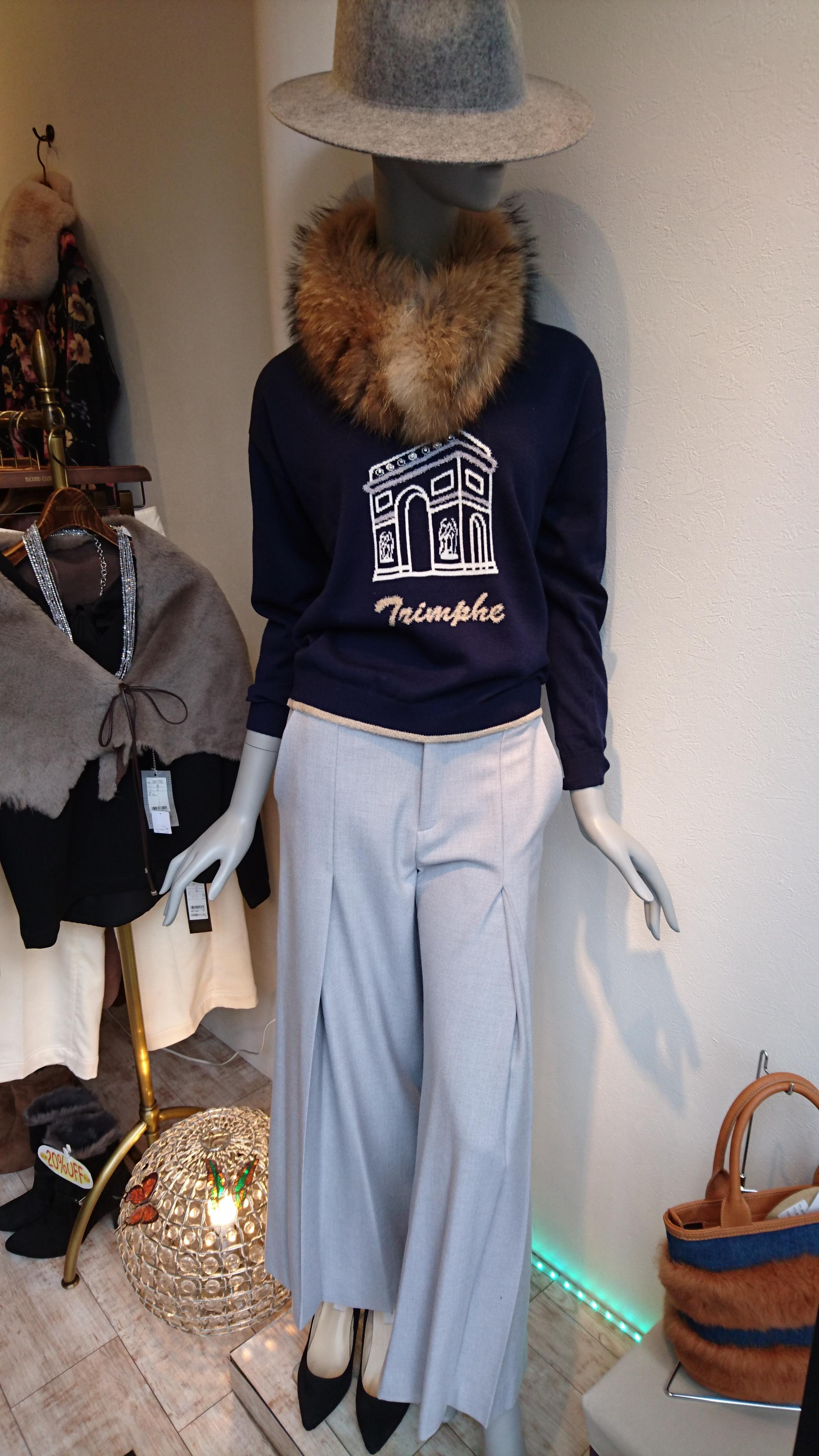 ワイドパンツとインターシャのニット♪ かっこよいタックの入ったワイドパンツと凱旋門のニット♪ 大人っぽくかっこ良く着こなしてみてはいかがですか~ ニット 11880円 パンツ 15984円 2016年12月14日
