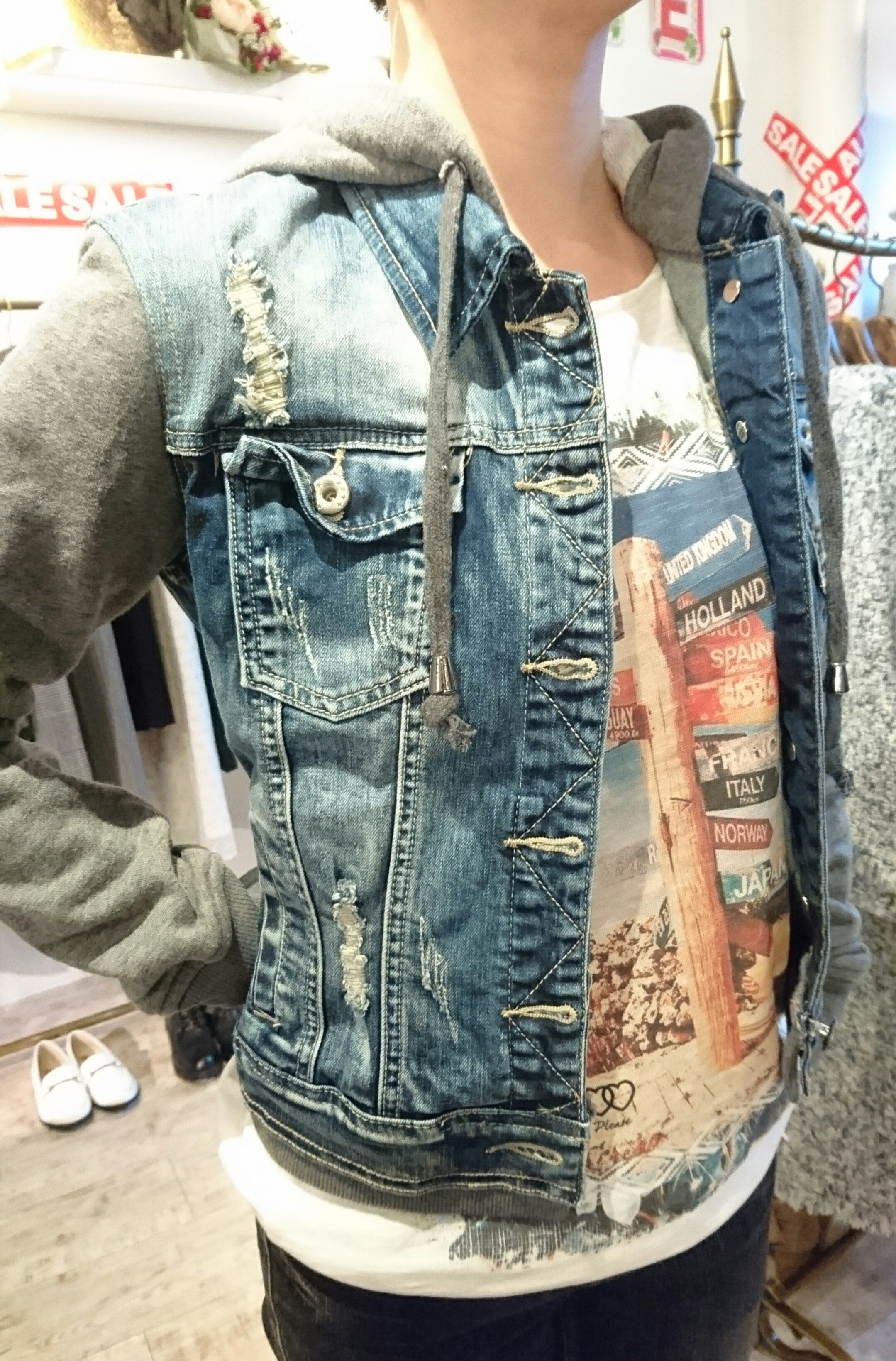 デニムジャケットとインポートTシャツ♪ フードつきのデニムジャケットとインポートTシャツのコーディネートです♪ デザイン性のあるジャケットはなかなか他では手に入らないですよ~ ジャケット 12744円 Tシャツ 5400円 2017年1月31日