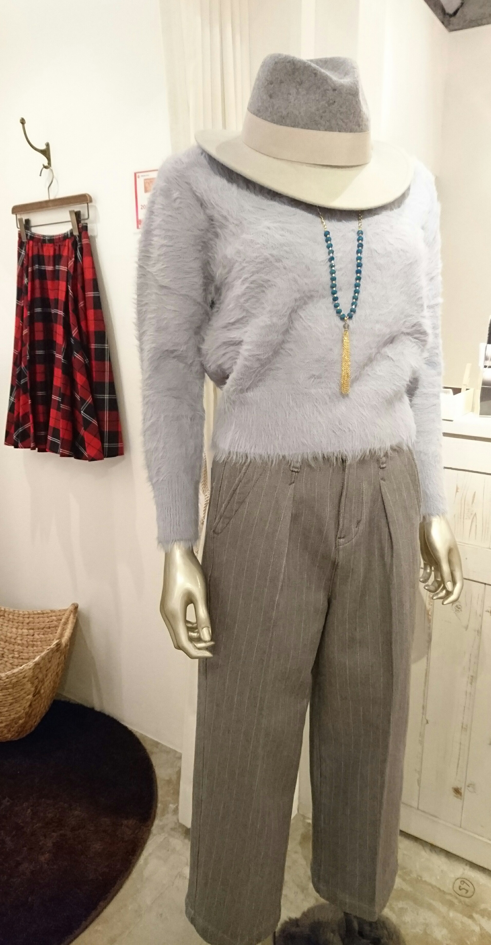 きれいなアイスブルーのシャギーニットと裏起毛のワイドパンツ♪