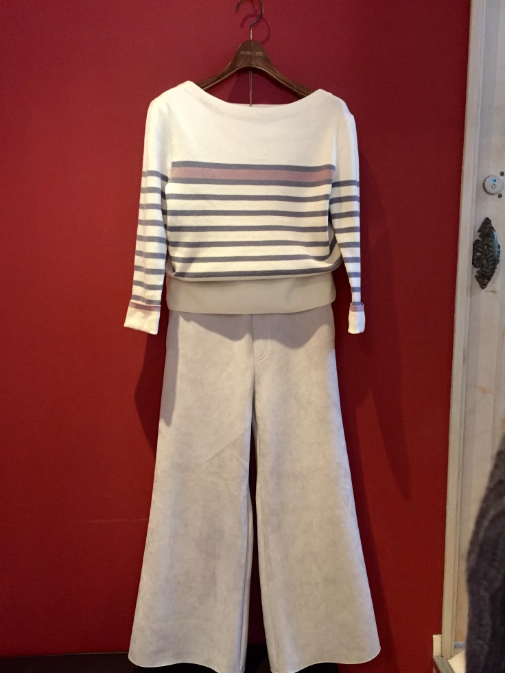 春コーディネート 7900円+11000円 ボーダーのスッキリニットとスゥェードのワイドパンツの組み合わせです 大人気のコットンニットにボーダーが仲間入り💓シンプルな着こなしのアクセントになります パンツは、ストレッチスゥェードなので、伸縮して履きやすいです 他にグレー、ベージュもございます(⌒▽⌒) 人気商品なのでお早めにーーーー 2017年1月25日