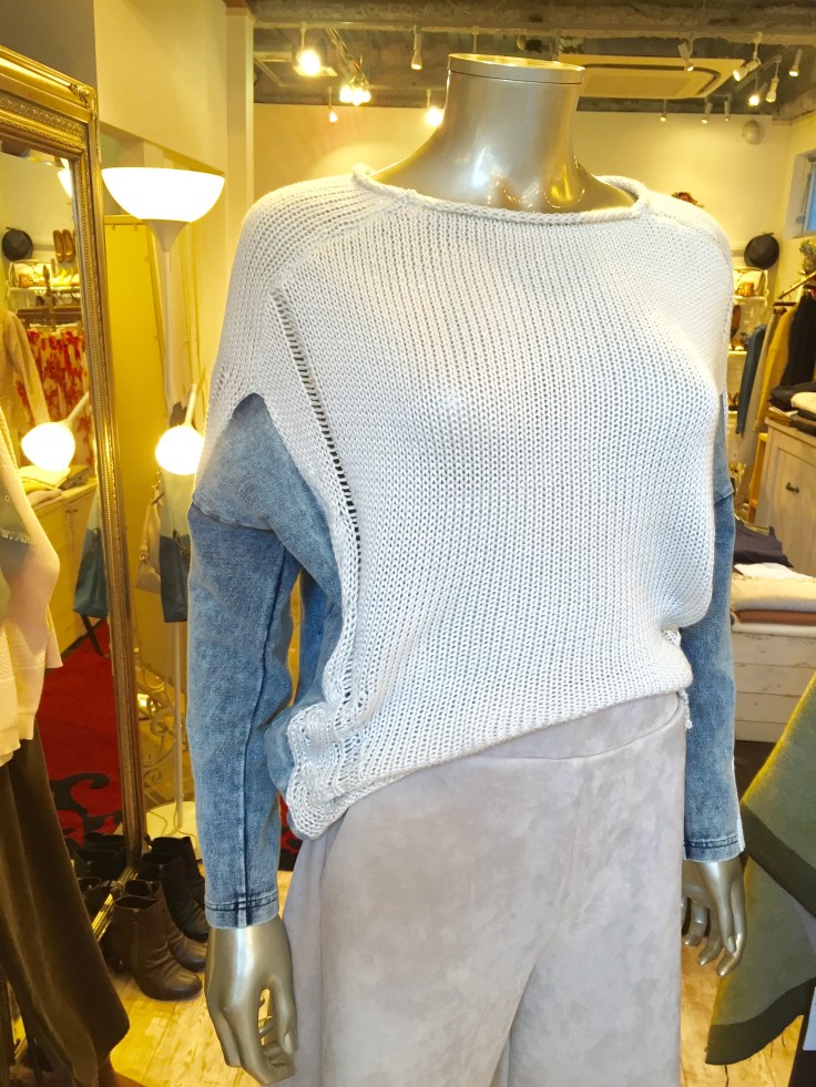デニム切り替えの春ニット 冬も大人気だった バックがストレッチデニムの切り替えニットの 春バージョン💓 入荷しましたぁー(⌒▽⌒) 正面がオフ白と グレーの2カラーで展開してます 完売必至ですので、気になる方はすぐにご連絡下さいませねー デニム切り替えニット 10584円 2017年2月3日