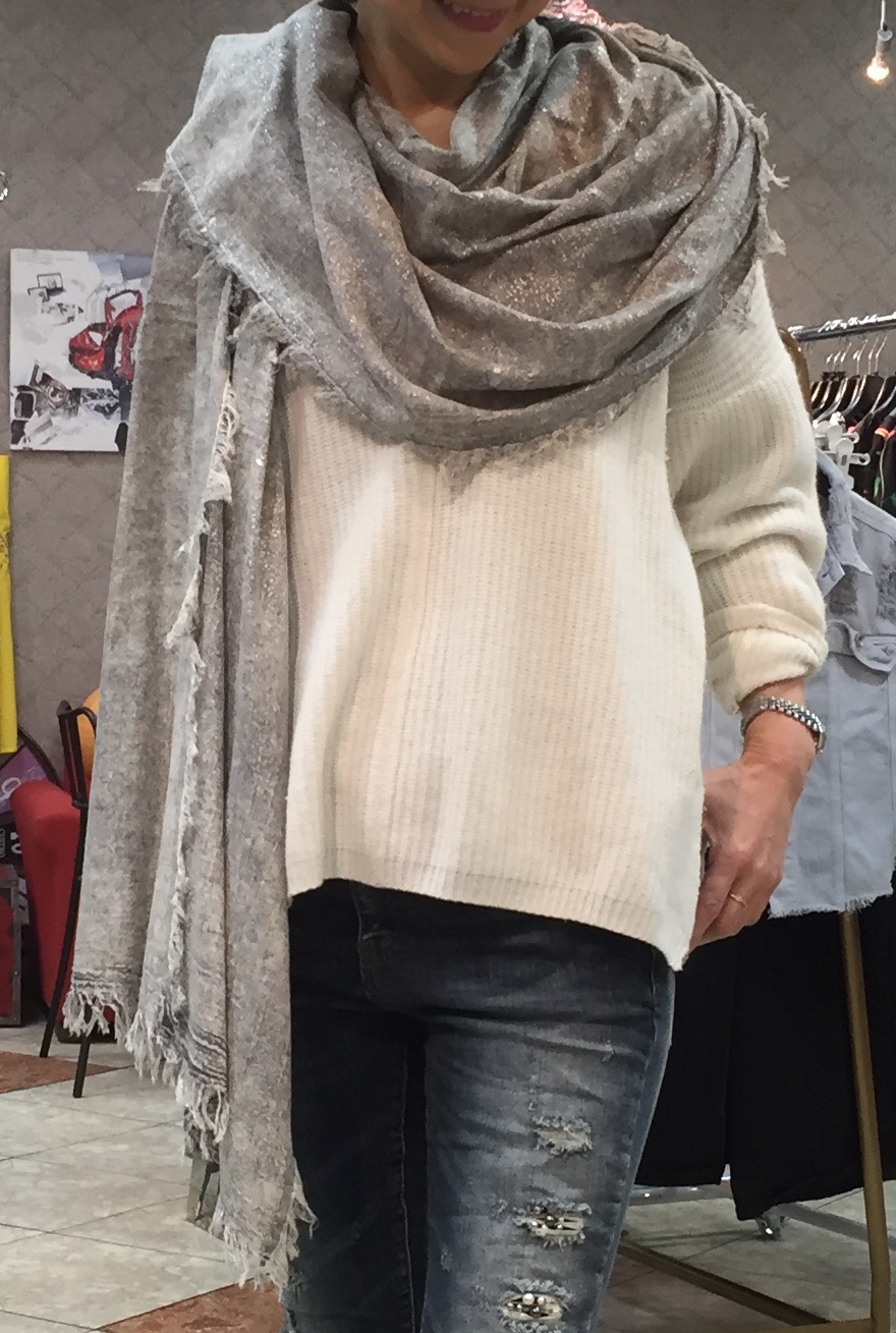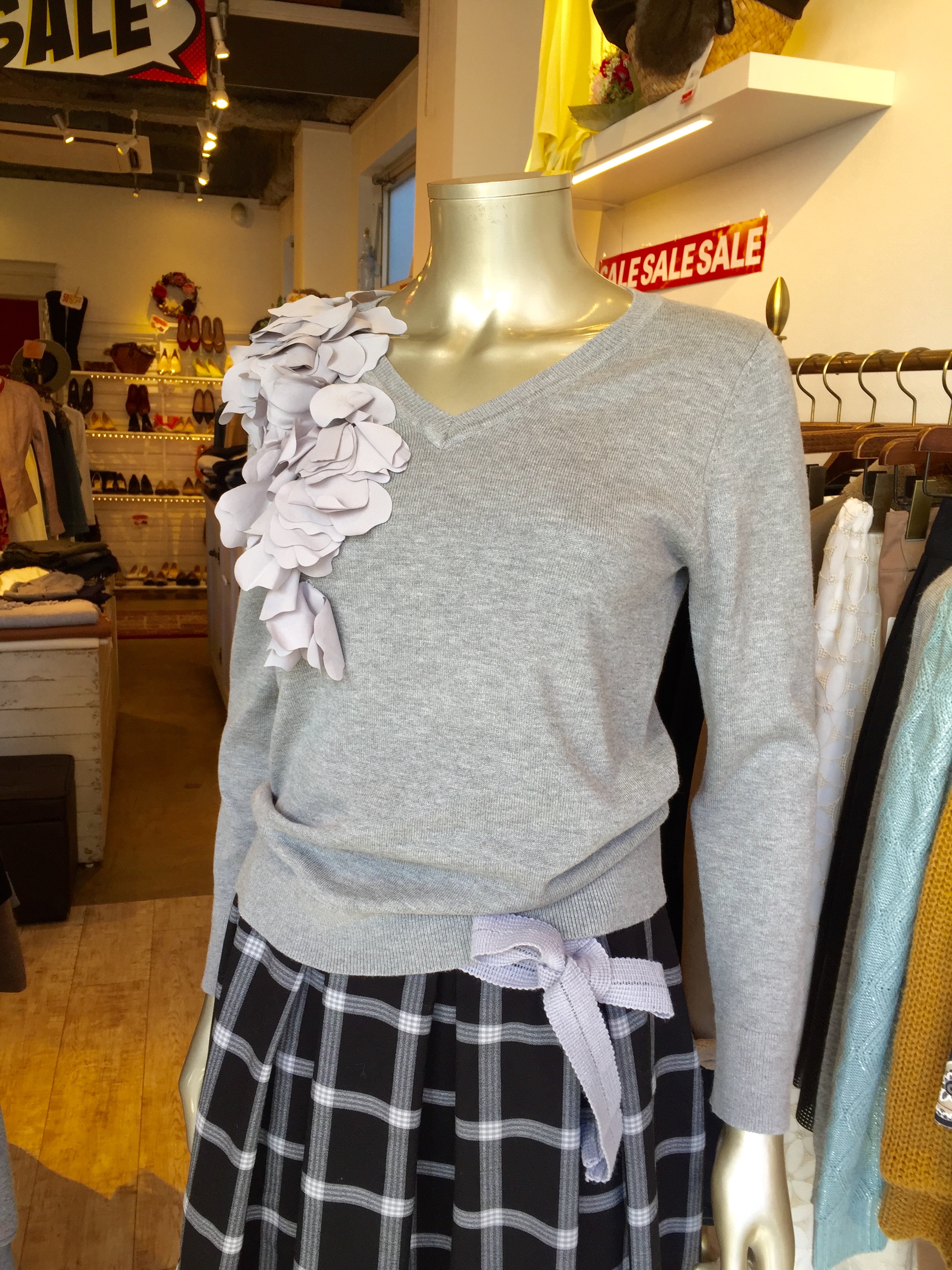 春のデザインニット 花びらのモチーフがとってもオシャレなデザインニットです こちらのグレーと オフ白がございます 神戸の老舗ニットブランドの自信作💓 お気に入りの一枚になりますよぉ〜 2017年2月7日