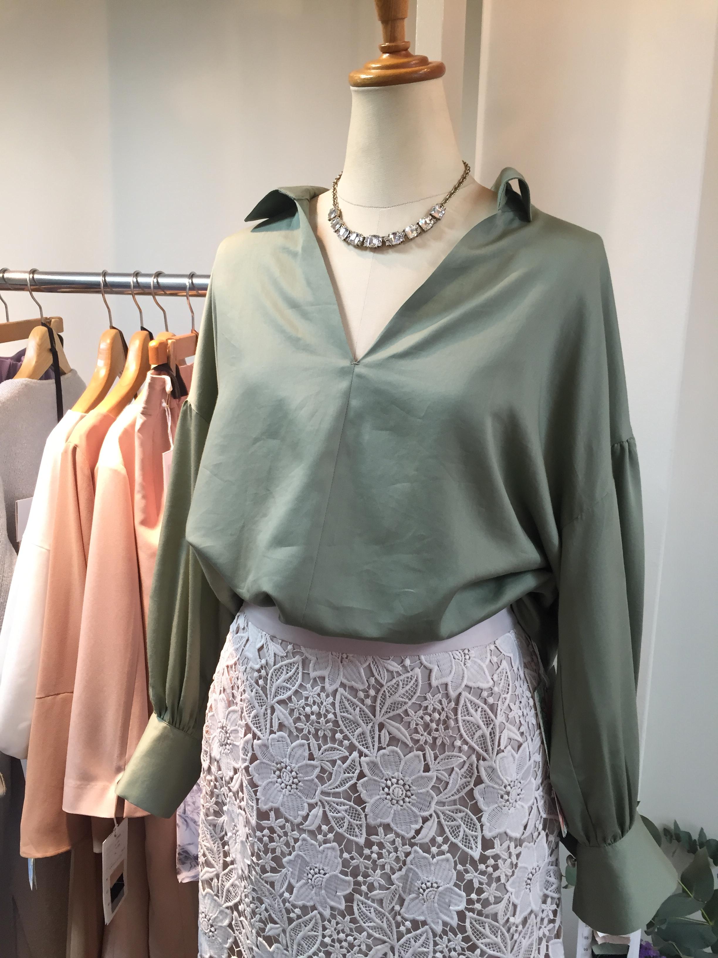 スキッパーブラウス スモーキーグリーン パールががった光沢感が素敵なスキッパーブラウスが入荷しました💓 メイドインJAPAN のクオリティ💓 お色違いでオフホワイトもございます 大人になったら、上質なシャツを1枚ご用意されると良いですよぉ〜 2017年2月15日