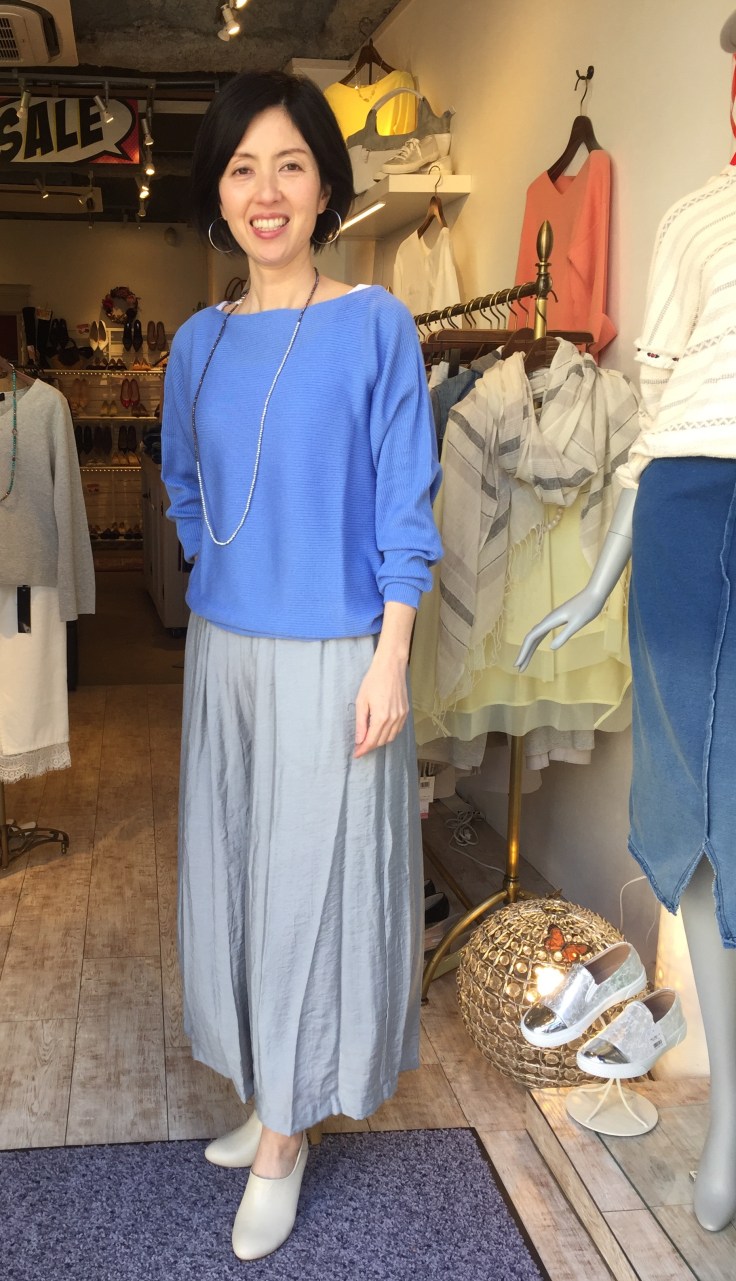 春ニット 6900円 ワイドパンツ 3900円 綺麗なブルーのデザインニットとワイドパンツのコーディネートです ワイドパンツは、2月限定の特別品💓 お色はネイビー、グレー、ベージュの3カラーで展開しております 完売必至ですよぉ〜 ニット 6900円 ワイドパンツ 3900円 シューズ 23800円 2017年2月19日