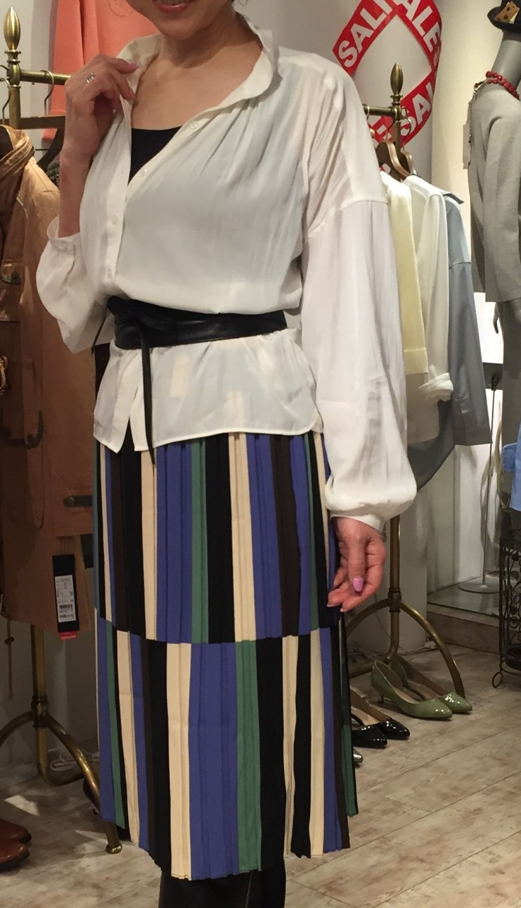 とろみブラウス 8900円 サッシュベルト5900円 オフホワイトのシフォンブラウスは、上質な生地のとろみ感がたまりませんーーっ! プリントのプリーツスカートとサッシュベルトで思いっきり今年のスタイリングを楽しんでみてくださいねーーーー デニムで合わせても素敵です 2017年2月26日