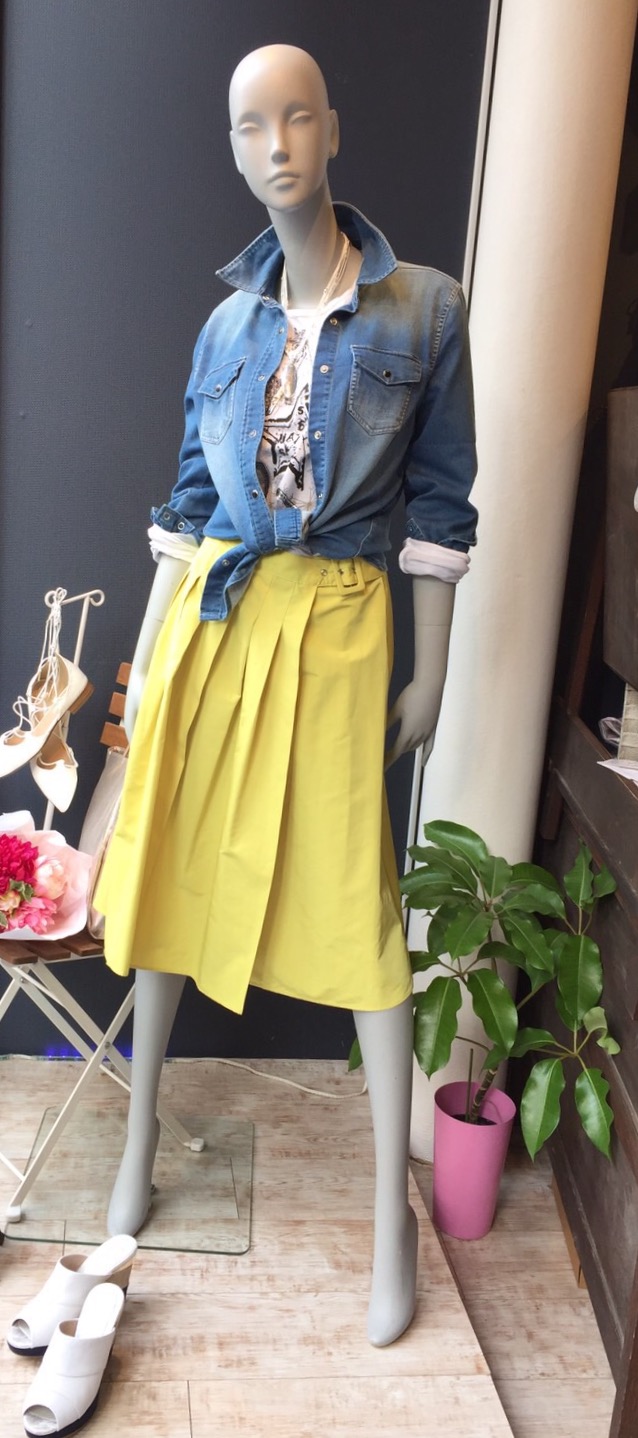 サフランイエローのスカート 9800円 今年気になるイエローやブルー💓 こんな爽やかなスカートならトライしやすいのではーーー?(⌒▽⌒) ペールトーンのピンクやアイボリーも展開しております 2017年3月1日