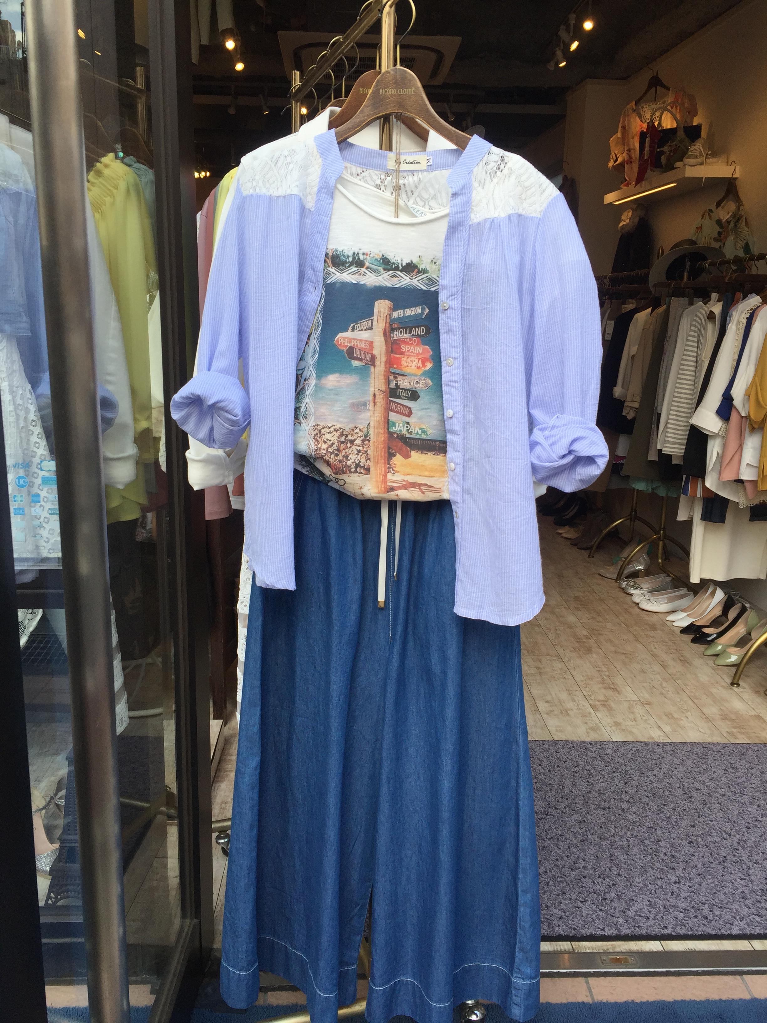 デザインブラウスとデニムワイドパンツ 肩にレースを配ったデザインブラウスはイタリアのインポート💓 テイシャツの羽織りとしても活用度大‼️ 薄手のコットンなので真夏まで大活躍です ブラウス 8900円 デニムパンツ 5900円 2017年3月17日