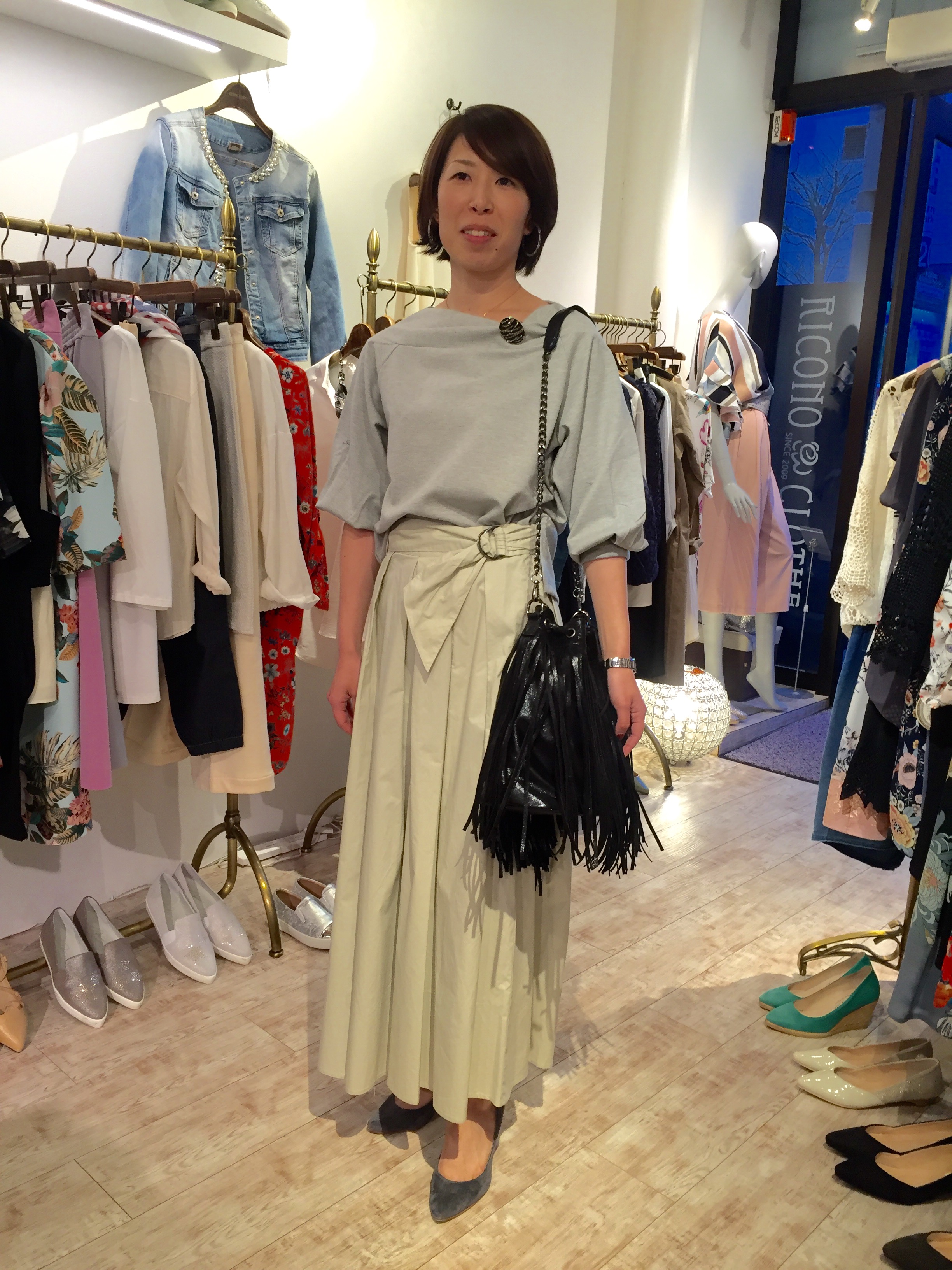 デザイントップス 3900円 立体的なデザインのプルオーバーと、布帛のワイドパンツのコーディネートです ボトムスの素材の高級感がプチプラのトップスまでも引き立てて、洗練された大人カジュアルの完成です💓 胸元のブローチとフランスインポートのフリンジバックでアクセントをオン💓 モデルはお客様の根子さんです とっても良くお似合いですーーー💓💓💓 2017年3月22日