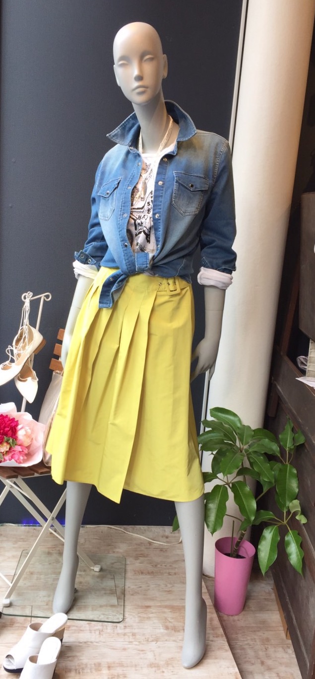 スカート イエローが 再入荷です💓 今期大人気のイエローカラー 💓💓💓 軽くってオシャレなウエストバックルのデザインスカートが再入荷しております💓 定番の黒やパウダーピンクもございます 汗をかいてもさらっとした着心地が気持ち良いですよぉ〜 スカート 9800円 デニムシャツ 11000円 2017年3月22日