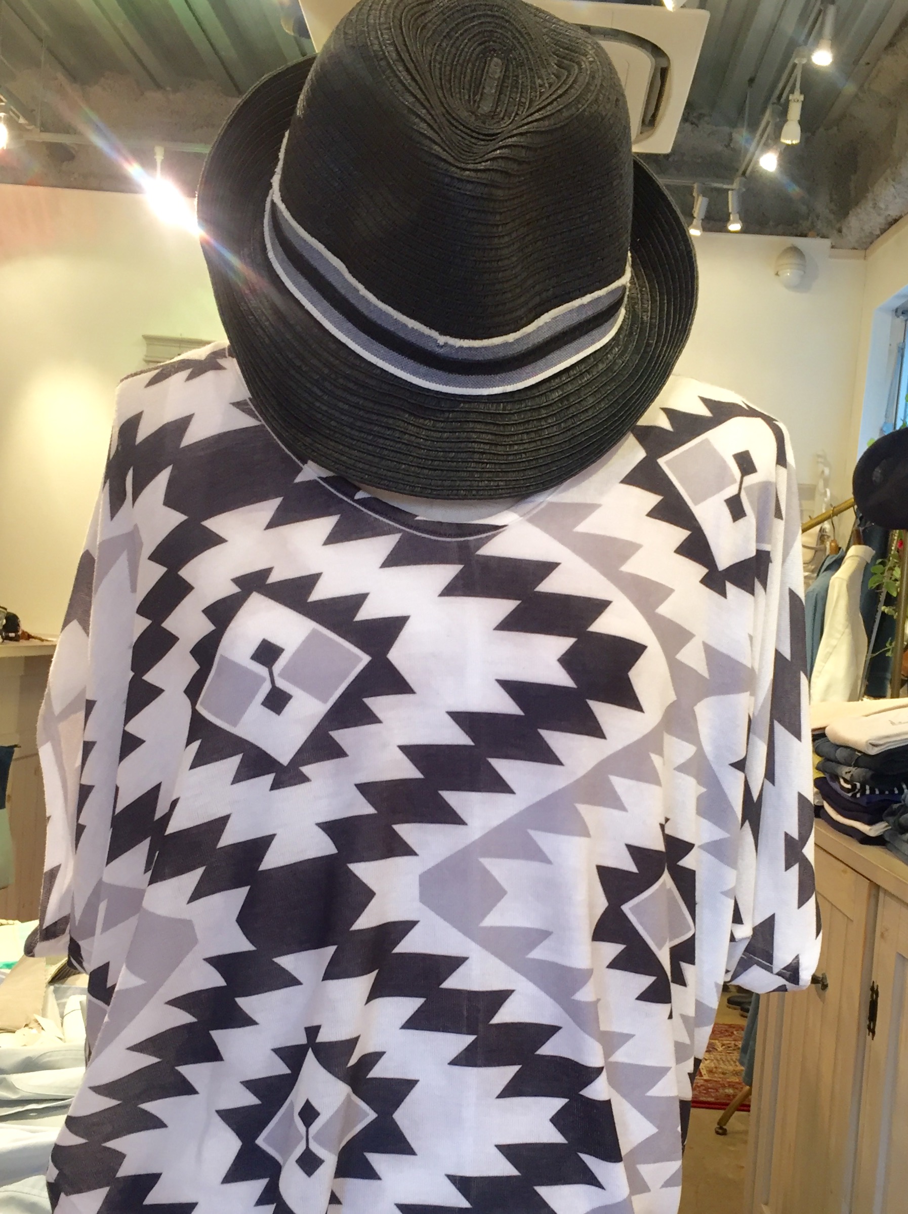 エスニックTシャツと 中折れハット アメリカからインポートしたカッコ良いプリントTシャツは一点物💓💓💓 墨黒の中折れハットでクールにスタイリングはいかがでしょうか? ボトムスは、白いロングスカートなんかで、甘辛ミックスーーーー 今日も新作が10型入荷です💓💓💓 2017年4月6日