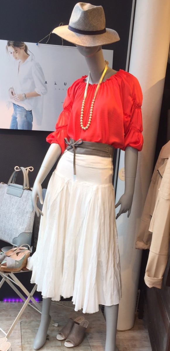 透けない 白スカート 初夏はやっぱり白スカートが無くちゃ始まらないっ! ぜひ新作の白いスカートで着こなしをフレッシュに一新させてくださいねーーー 12枚ハギの白スカート 11000円 本革サッシュベルト 4900円 ハット 5900円 2017年4月12日