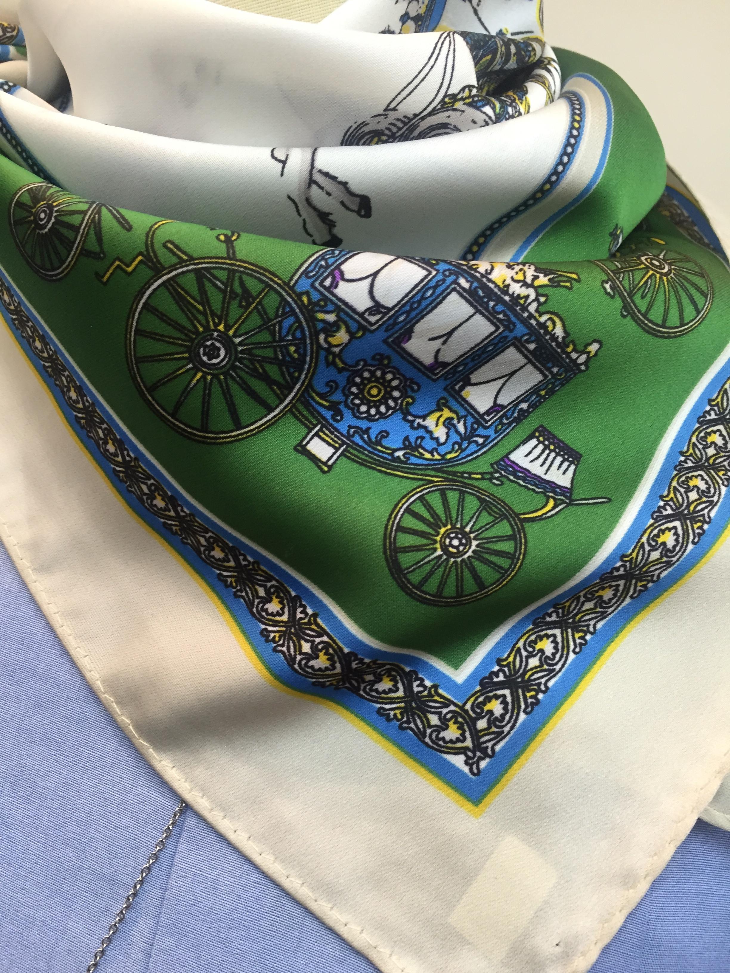 今季人気のプリントスカーフが入荷してます (⌒▽⌒) 首に巻いたりバックにつけたり、自由自在ですよぉ〜 白にグリーンの爽やかなスカーフです