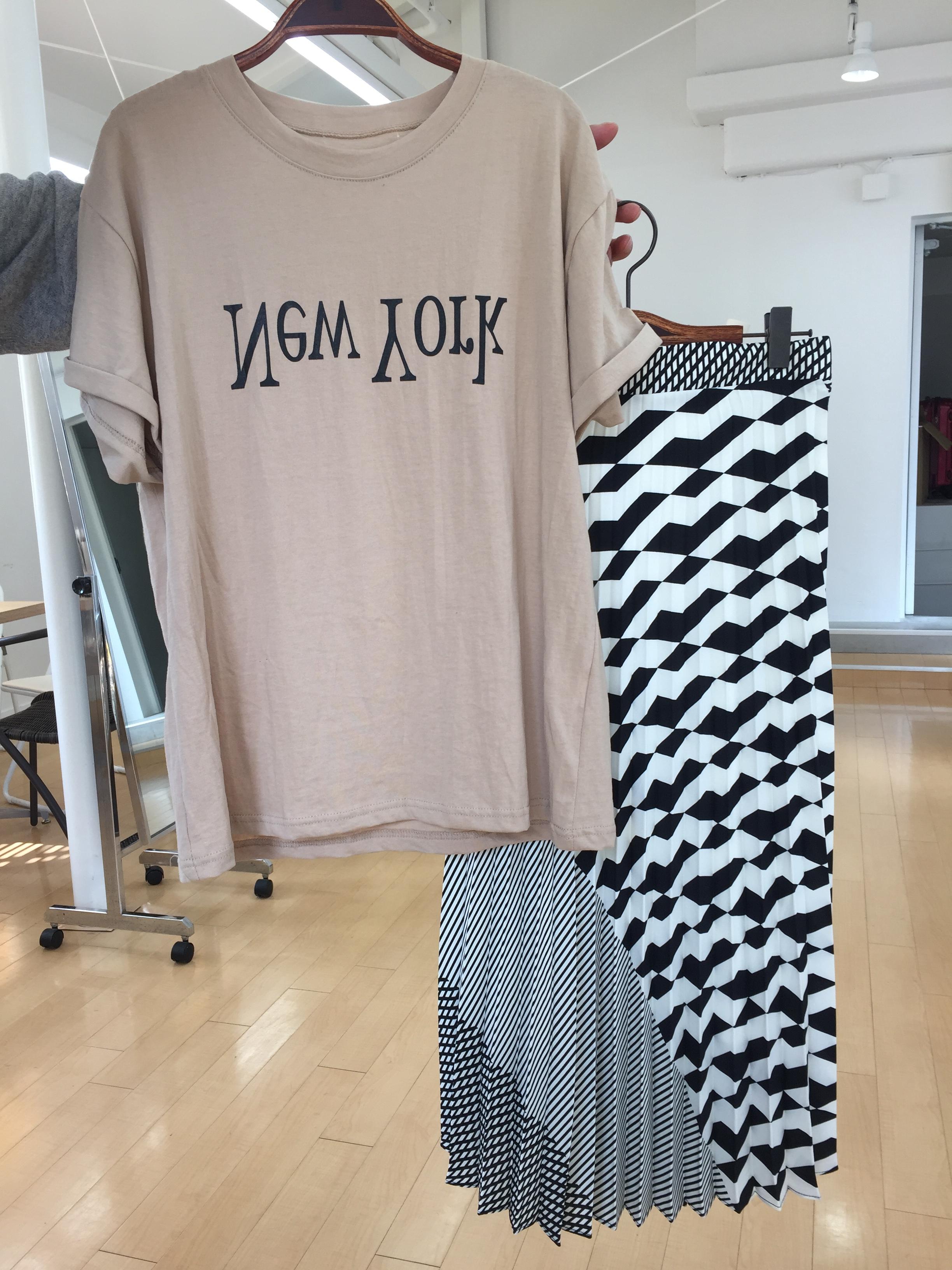 Tシャツとプリントプリーツスカート 英字のデザインTシャツと合わせてクールなプリントのプリーツスカートはいかがですか? 形状記憶のプリーツスカートは、美しい流れのあるプリーツがお洒落です💓 季節も長〜くお使いいただけますよぉ〜 2017年5月4日