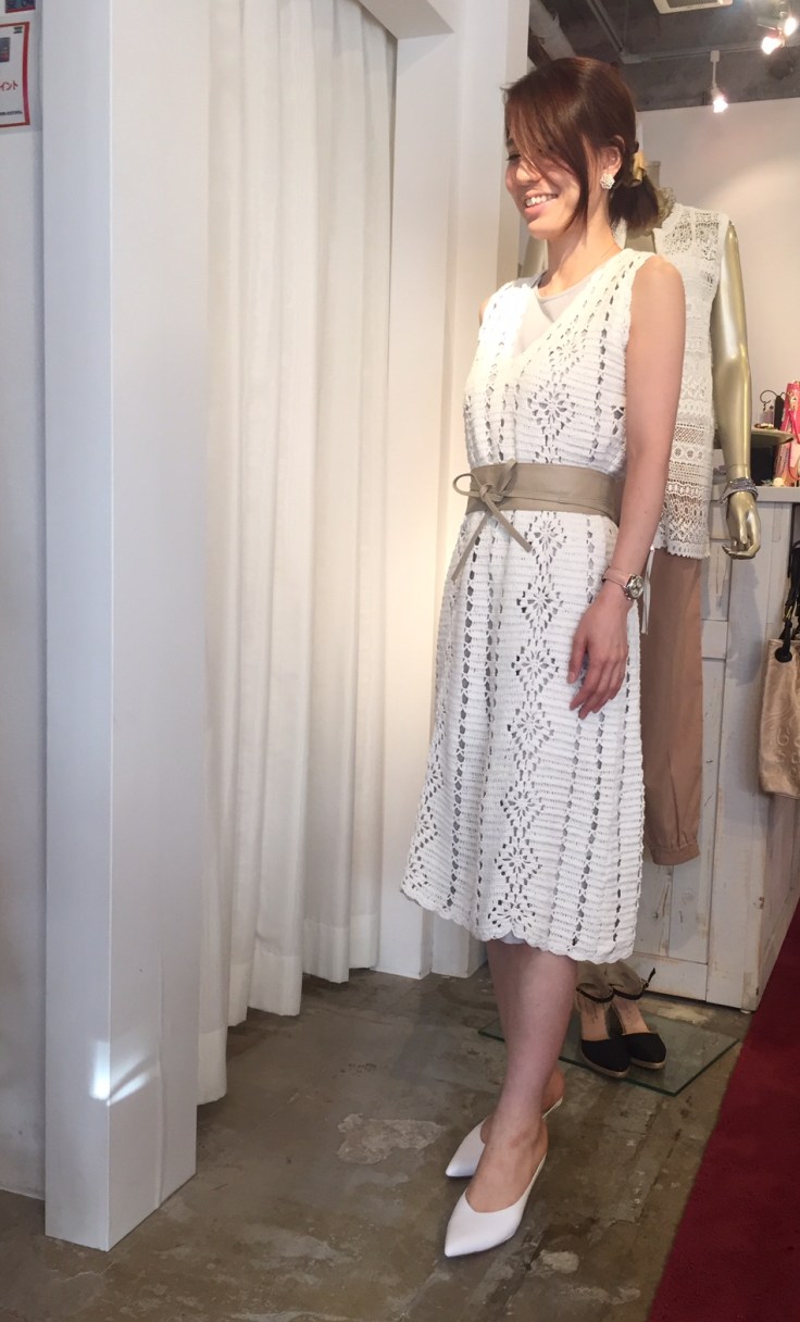 レースワンピースとサッシュベルト 今回入荷はフェミニンなレース編みのワンピース💓💓💓 清楚でカジュアルな感じが堪らない一枚! ワンピース 10800円 サッシュベルト 4900円 白ミュール 9800円 2017年5月23日