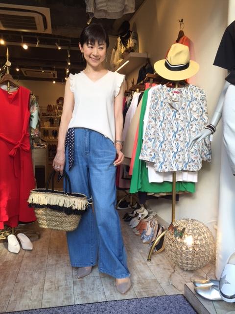 デザインデニムパンツ 12800円 ソフトな風合いのデニムパンツです。 サラッとしていて、真夏も涼しいですよぉ〜 トップスはコンパクトなフリルのブラウスで、少し甘くコーディネートしてみました カゴ 7900円 ブラウス 8900円 2017年6月8日