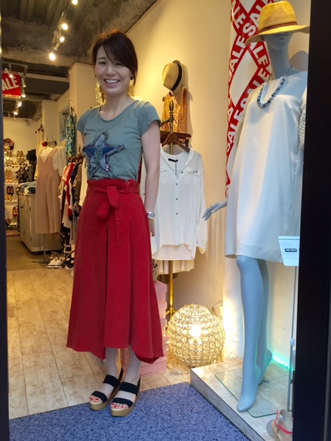 ダークオレンジのデザインスカート SALE 大人気の大人フェミニンな コットンブラウスと 新作のデザインスカートのコーディネートです 上質な素材感とスタイリッシュなデザインがポイント💓 ベージュとネイビーもございます スカート 13824円 ➡︎ 9677円 🌟🌟🌟 30%オフ‼️ サンダル 9720円‼️ 2017年7月5日