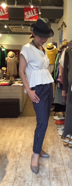 白ブラウス&ストライプパンツ💓 すっきり見えるコットン素材のストライプパンツが とってもお買い得になりましたっ 白ブラウスと合わせて、爽やかにコーディネート💓😃 これからの猛暑を爽やかに過ごせる一枚です 帽子 4212円 ブラウス 6712円 パンツ 9677円 山崎範子 2017年8月5日