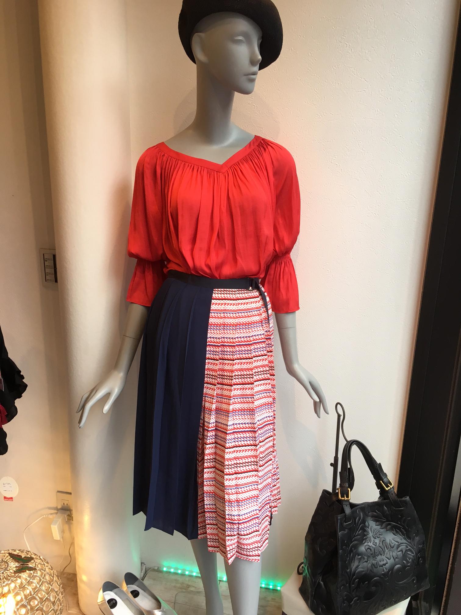 バックリボンブラウス 絞った袖と、背中のリボンが 可愛いブラウスが入りました🎀 ¥12,960 色は紺とオフホワイトもございます。 個性的なスカートにもバッチリ👍 スカート¥12,960 2017年8月24日