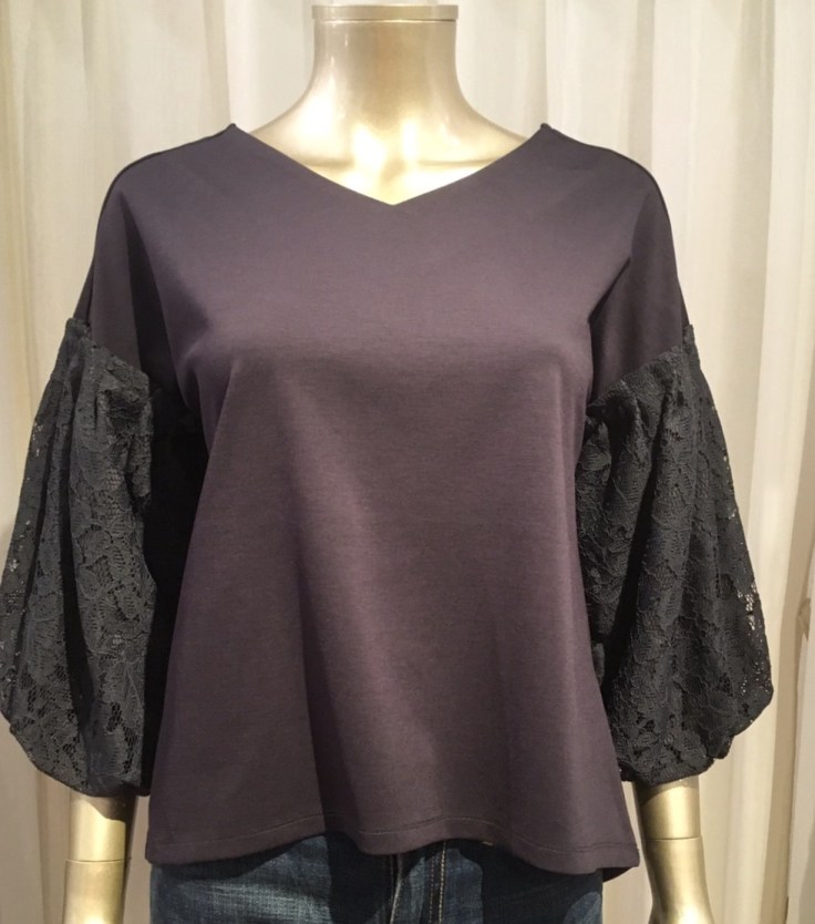 レース盛り袖プルオーバーチャコールグレー カットソーの身頃にレース盛り袖のお袖が旬なトップスです💓 すっきりしたVネックなので一枚ですっきり着られます モスグリーンと、チャコールグレーの2カラーです💓 レース盛り袖トップス 8900円 外税 2017年9月27日