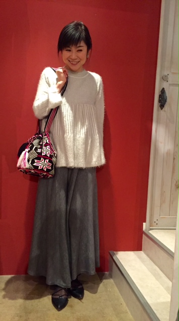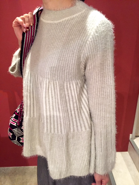 デザインニット 💓😃 放射線状に広がるAラインのデザインに、グレーのフェザー糸をミックスしたお洒落なニットです💓💓💓 サラサラの肌触りも堪りませんーーーっ ニットのフレアパンツと合わせていかがでしょう? ニットフレアパンツ 9800円 ニット 11000円 バック 18000円 全て外税 2017年10月30日
