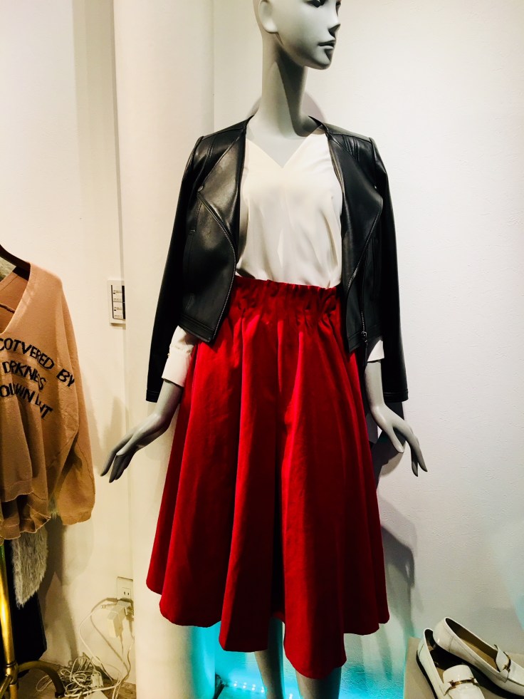 鮮やかな赤いスカート カラースカートが、この冬も流行⭐︎⭐︎ 年末に向けて赤いスカートはいかがですか?? 鮮やかで気分もウキウキしてきます💕 革ジャン¥52,920 スカート ¥7,452 2017年10月29日