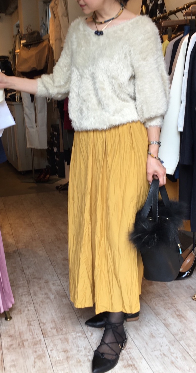 ニットのコーディネート💓 こちらがライトベージュです(⌒▽⌒) マスタードカラーのロングスカートと合わせてみました💓 ニット 6900円 スカート 9800円 バック 12000円 全て外税 2017年10月4日