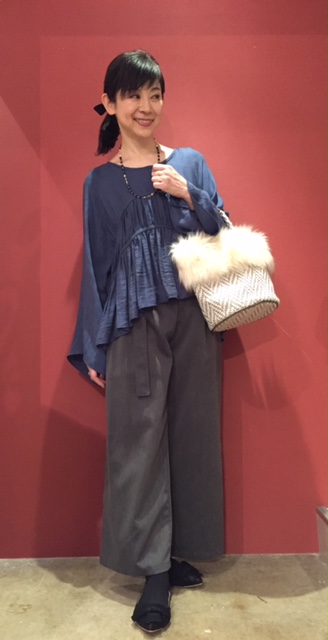 ブルーのデザインブラウスとワイドパンツ💓 秋色のカラーが素敵なビックシルエットのデザインブラウスにシンプルなワイドパンツをコーディネートしてみました。 パンツもブラウスも生地が厚すぎず、春先まで長いシーズンにお使いいただけます💓 本日は13時オープン💓となっております 台風一過で爽やかな自由が丘にぜひお越しくださいませー お会い出来ますのを楽しみにお待ちしております。 ブラウス 10800円 パンツ 10800円 ファーバック 8000円 全て外税 山崎範子 2017年10月23日