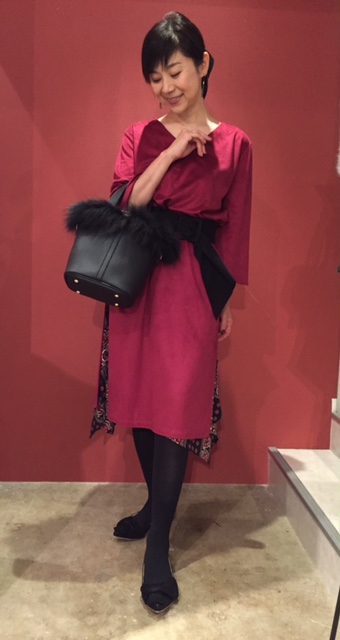 ダークレッドのワンピース 10800円 起毛したポリエステル素材のシンプルなワンピースに、プリントのスカーチョを重ね着してみました💓こちらは、サイドスリットの重ね着用のワンピースです。ワイドパンツやプリーツスカートに合わせてもぐっとおしゃれですよぉ〜 ベルト 3900円 本革リボンシューズ 9800円 フォックスファーのバック 12000円 全て外税 2017年10月23日