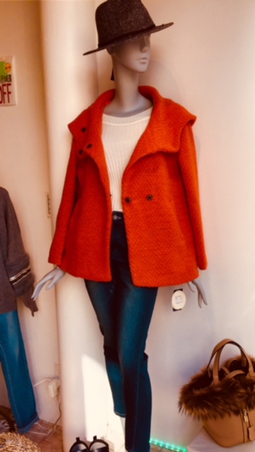 イタリア🇮🇹製ショートコート 鮮やかなマンダリンオレンジ🍊のショート丈コート♫ 前の合わせがダブル仕様になっていて、 上まで閉めると大きな襟が立ち上がり、とても暖か❣️😍✨✨ 他にスカイブルーもあります(o^^o)♪ コート ¥23,760- 2017年11月4日