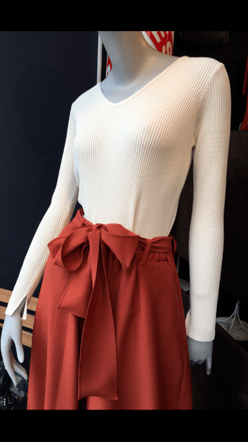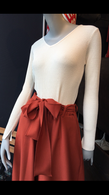 白いVネックニット 7452円🌟🌟🌟 今から、春先にかけて着られる美シルエットのニットです💓😍 女らしく程よく開いたネックラインで、小顔効果💓もバッチリです👍 オフ白、ネイビー、ブラックの3カラーです もちろん着心地もバッチリでーす リボン付きスカート 8921円💓 2018年2月4日