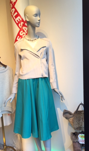 エメラルドグリーンのスカート 6900円💓💓💓 春の新作はフレッシュなエメラルドグリーンのフレアスカートです💓 アイボリーのストレッチライダースで爽やかなコーディネートはいかがでしょう? ライダースジャケット 13824円 スカート 7452円 限定数となっております 2018年2月8日