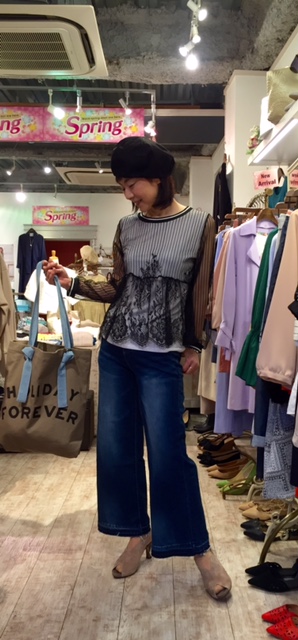 レースブラウス イタリアインポート ストレッチデニムが履きやすくて大人気です💓 追加入荷でおサイズ揃いました(⌒▽⌒) インポートのブラウスと合わせていかがでしょう? ベレー帽 3600円 デニム 13800円 ブラウス 12800円 バック 6900円 サンダル 17000円 全て外税 2018年3月10日