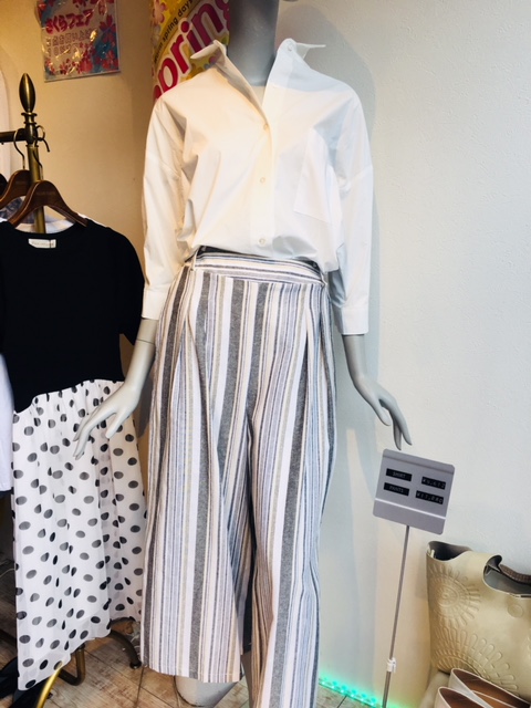 襟元のカットが綺麗な白シャツ💕 ¥9,612 ストライプがさわやかなパンツ ¥11,880です。