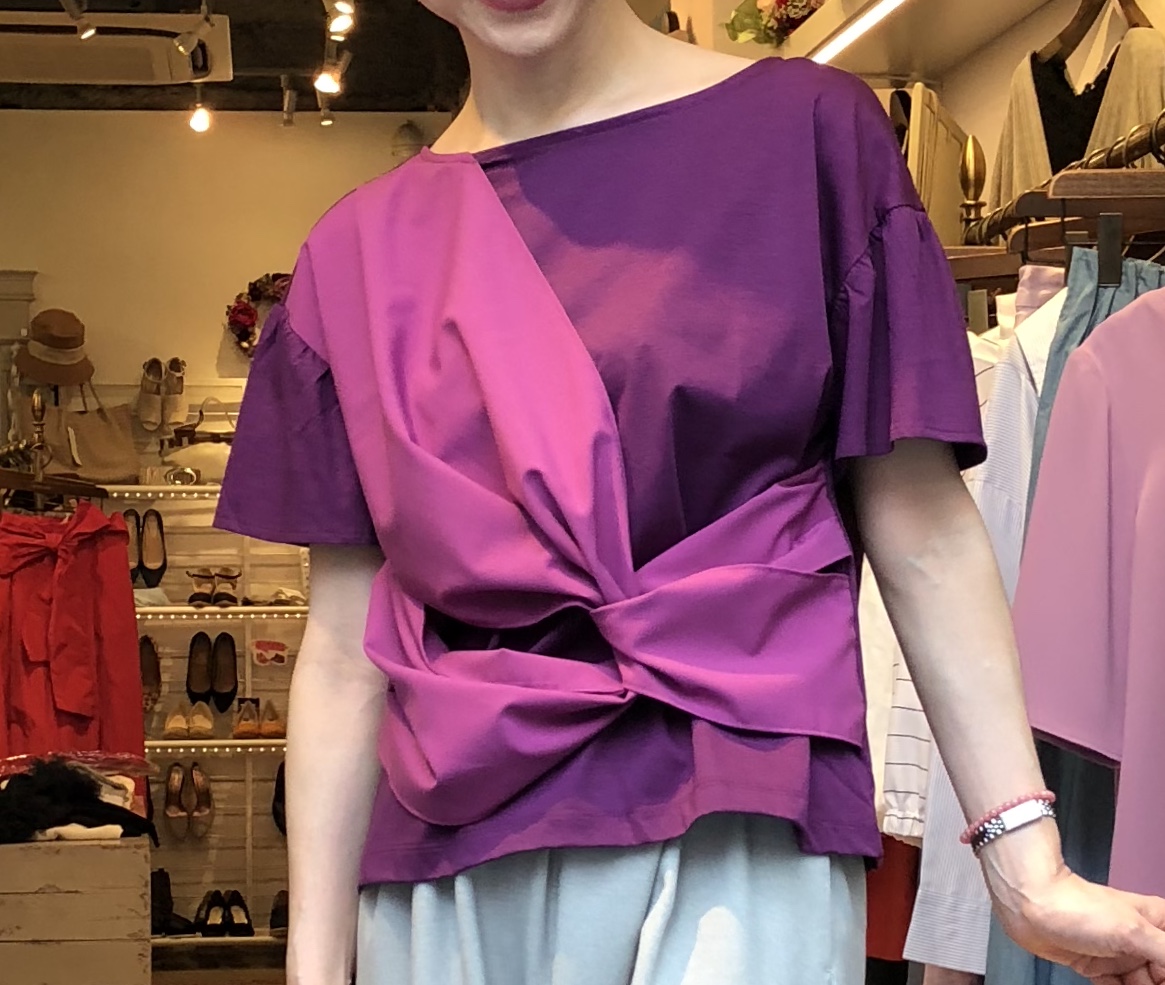 パープルのデザインカットソー シックなパープルカラーのかなりおしゃれなTシャツです💓 この春、ラベンダーやパープルはとても華やかで気になるカラーです グレーやベージュともとても相性が良いですよ😃 デザインカットソー 8900円 白もございます 2018年4月7日