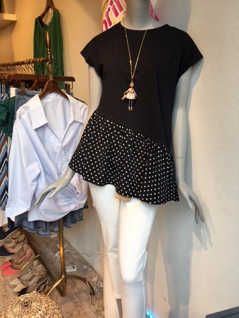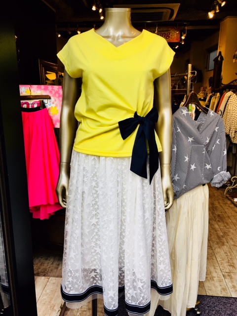 vネック リボン付きTシャツ 厚手のvネッTシャツ👚 サイドのリボンが可愛い一枚です😍 Tシャツ 白、黒、黄色、グレー、ネイビー ¥8,612 スカート 白とネイビー ¥14,040 2018年4月22日