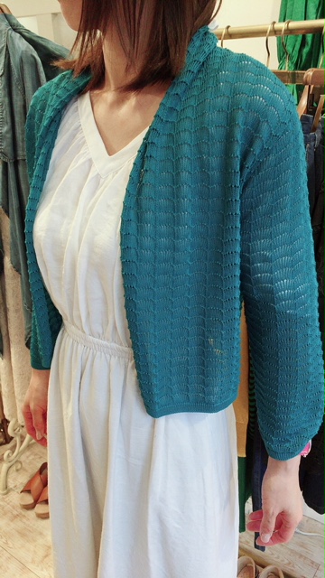 ショート丈のカーディガン 8900円 お洒落な編み地のショート丈カーディガンが入荷しました💓😃 ワンピースやテイシャツの羽織ものとしてとっても重宝ですよん お写真のターコイズブルーの他に、ブラックとホワイトの3カラーで展開しております 2018年4月22日